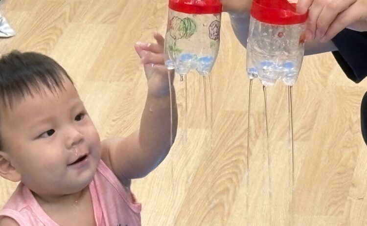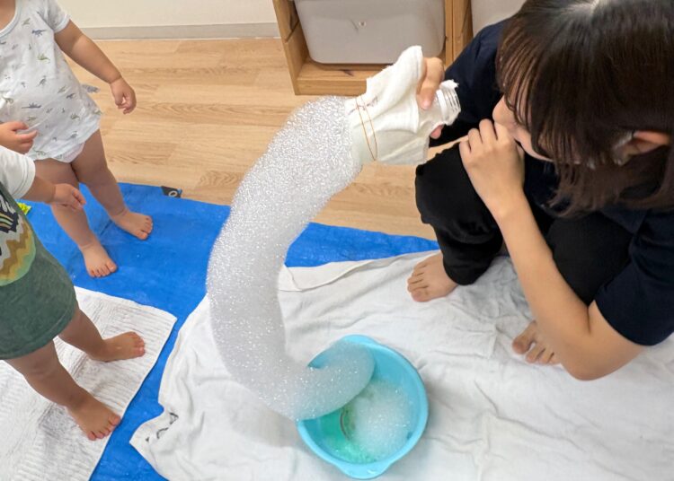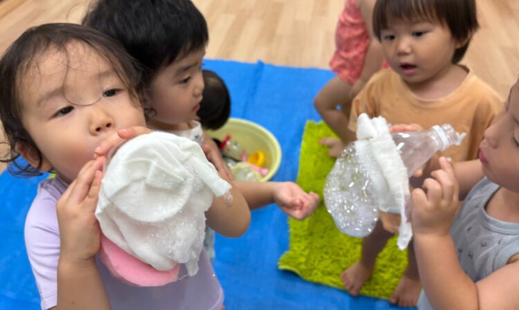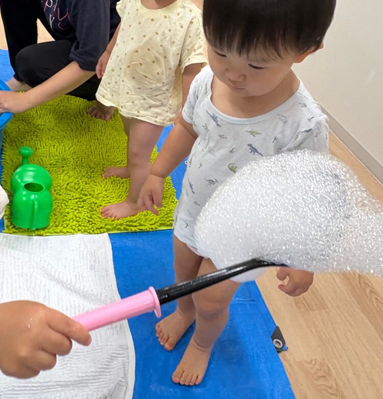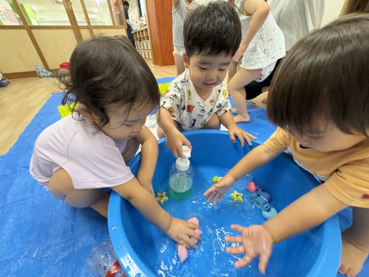 お友だちと一緒にバケツに水を入れたり、ジョウロで水をかけあったり、泡遊びをしたり‥。