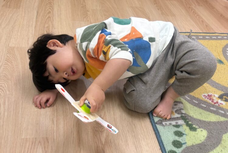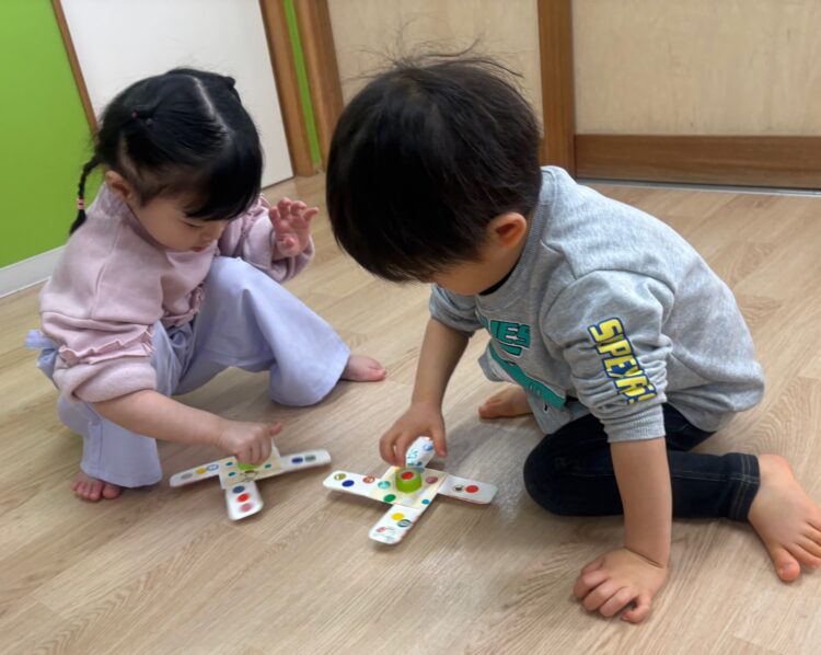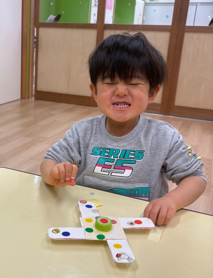 完成したこまを回してみると、くるくる回る動きに目を丸くして見つめたり、何度も回そうと挑戦したりする子どもたち![]()