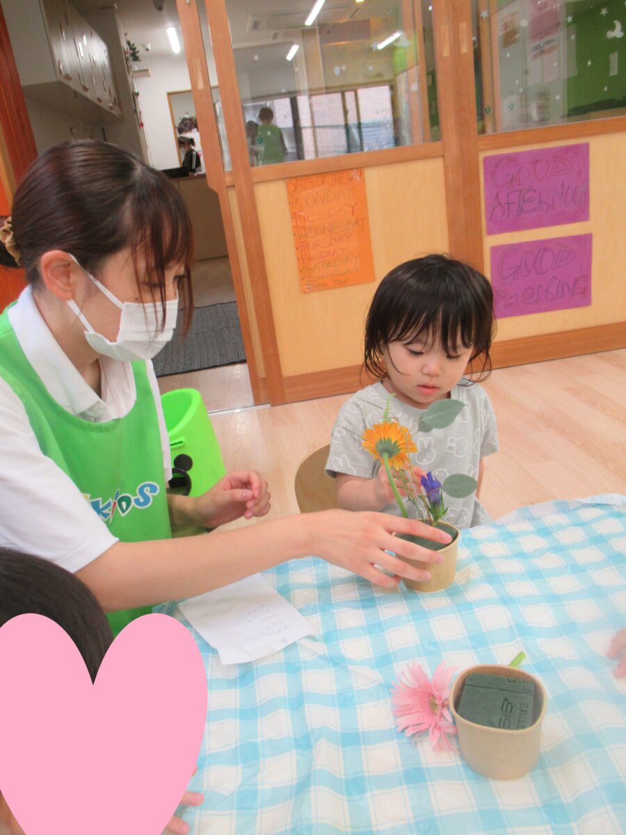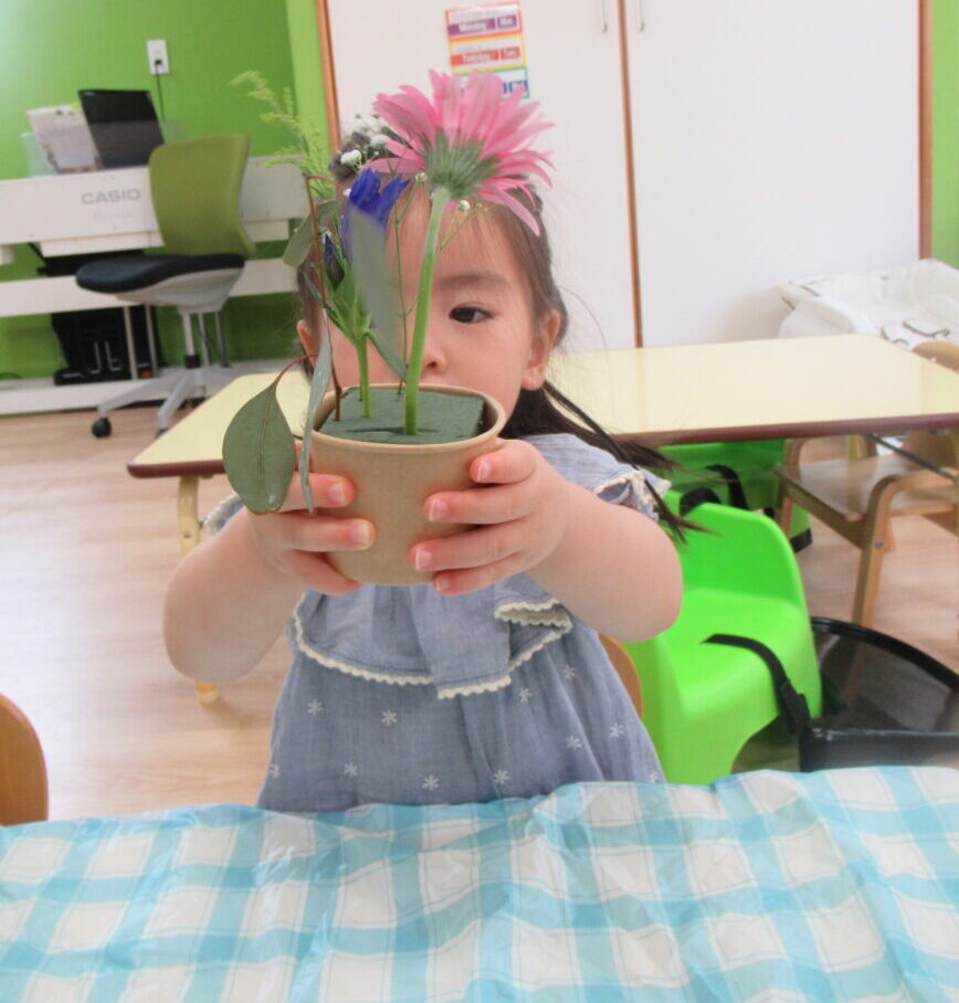 先生の話を聞いて上手に花を挿しています。