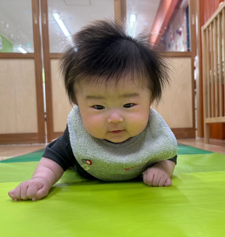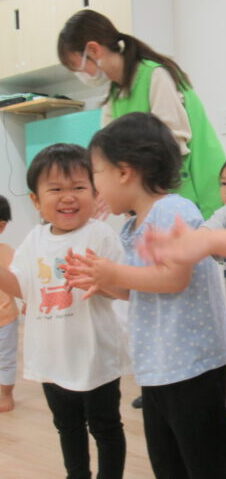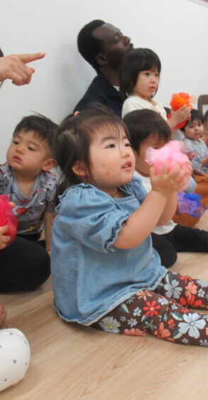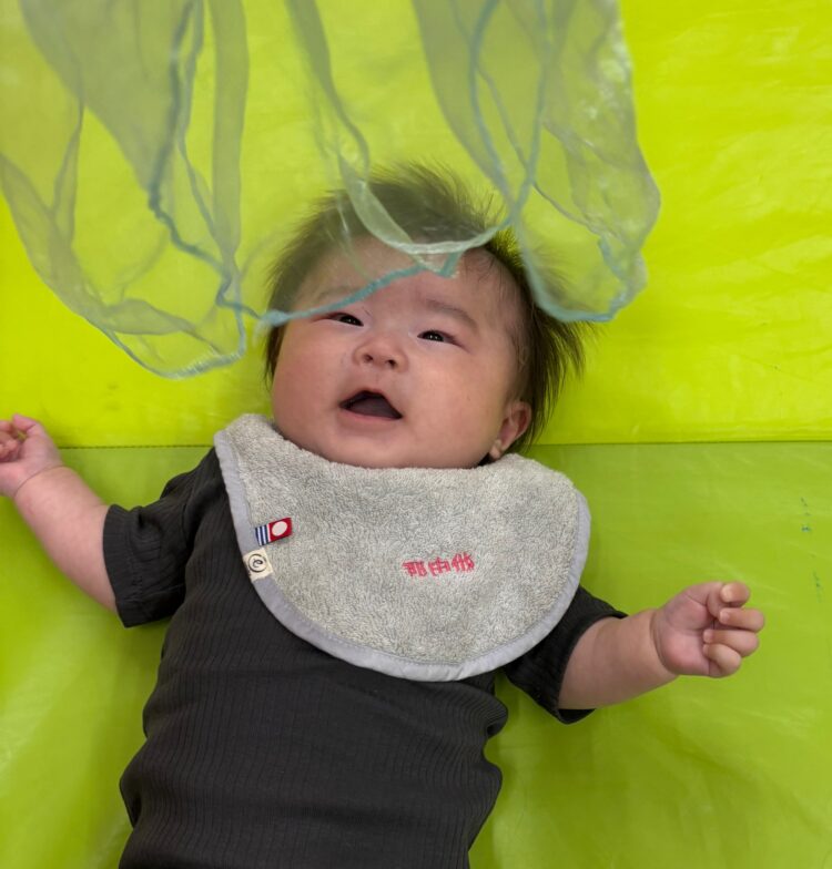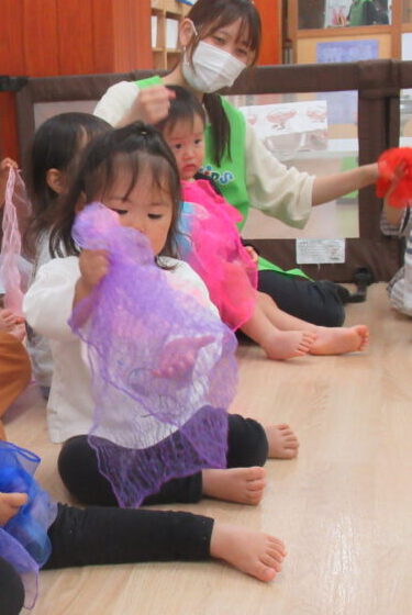 小さな赤ちゃんでもスカーフに触れる、握る、目で追うなど、新しい刺激と経験になります。保育園で楽しく遊びながら発達の基盤をしっかりと育んで行きます。