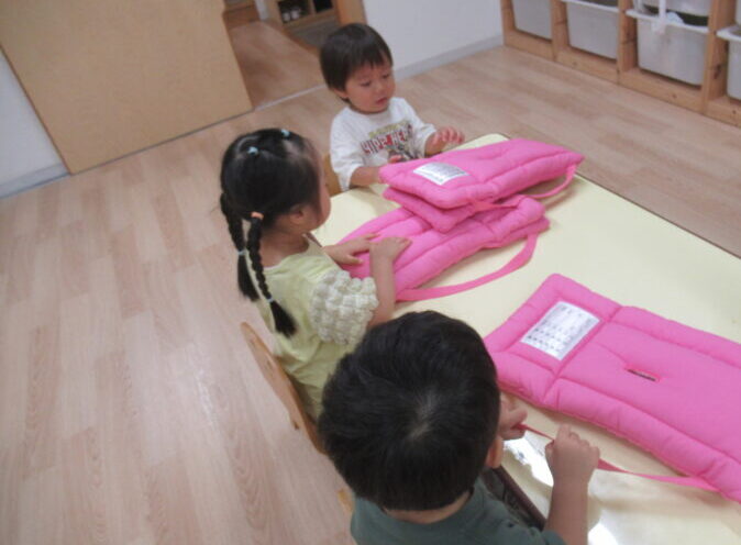 防災頭巾のかぶり方を練習しました