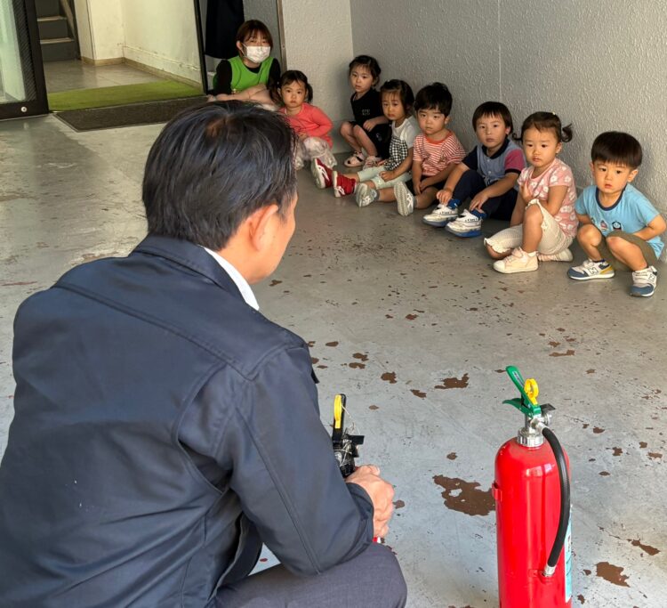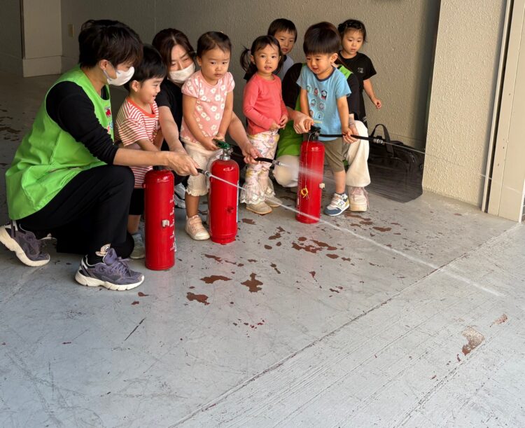 実際に消火器(訓練用)を使ってみると、「しゅ〜!」という音と水が出て子どもたちは驚いた様子でした。
