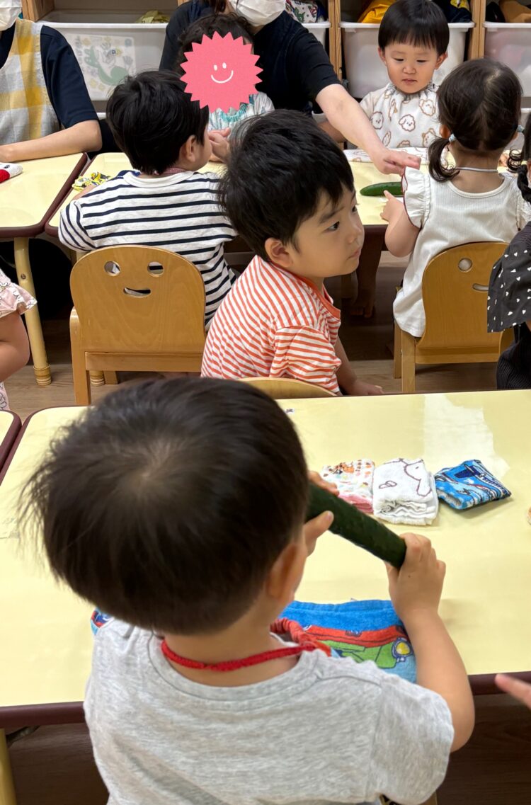 調理の先生が本物のきゅうりを見せると、子どもたちは興味津々✨