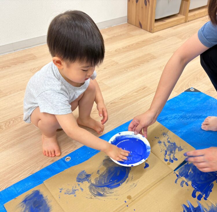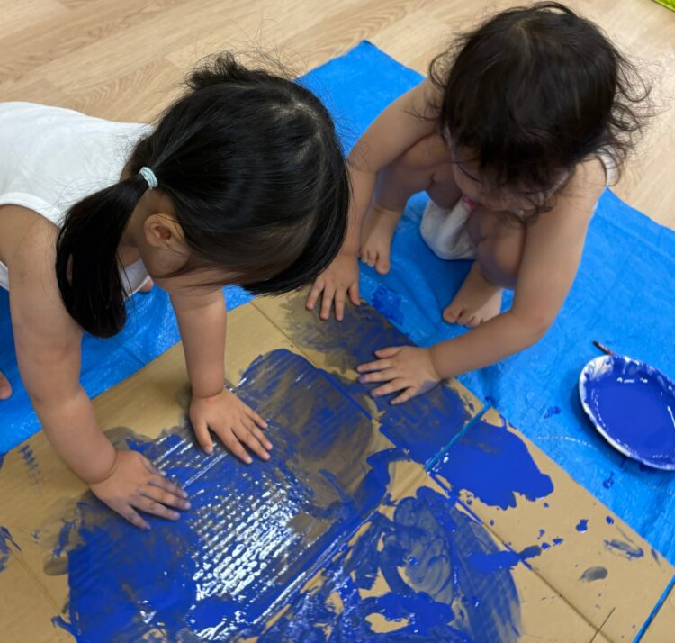 今日は、段ボールを使って絵の具遊びを、行いました。