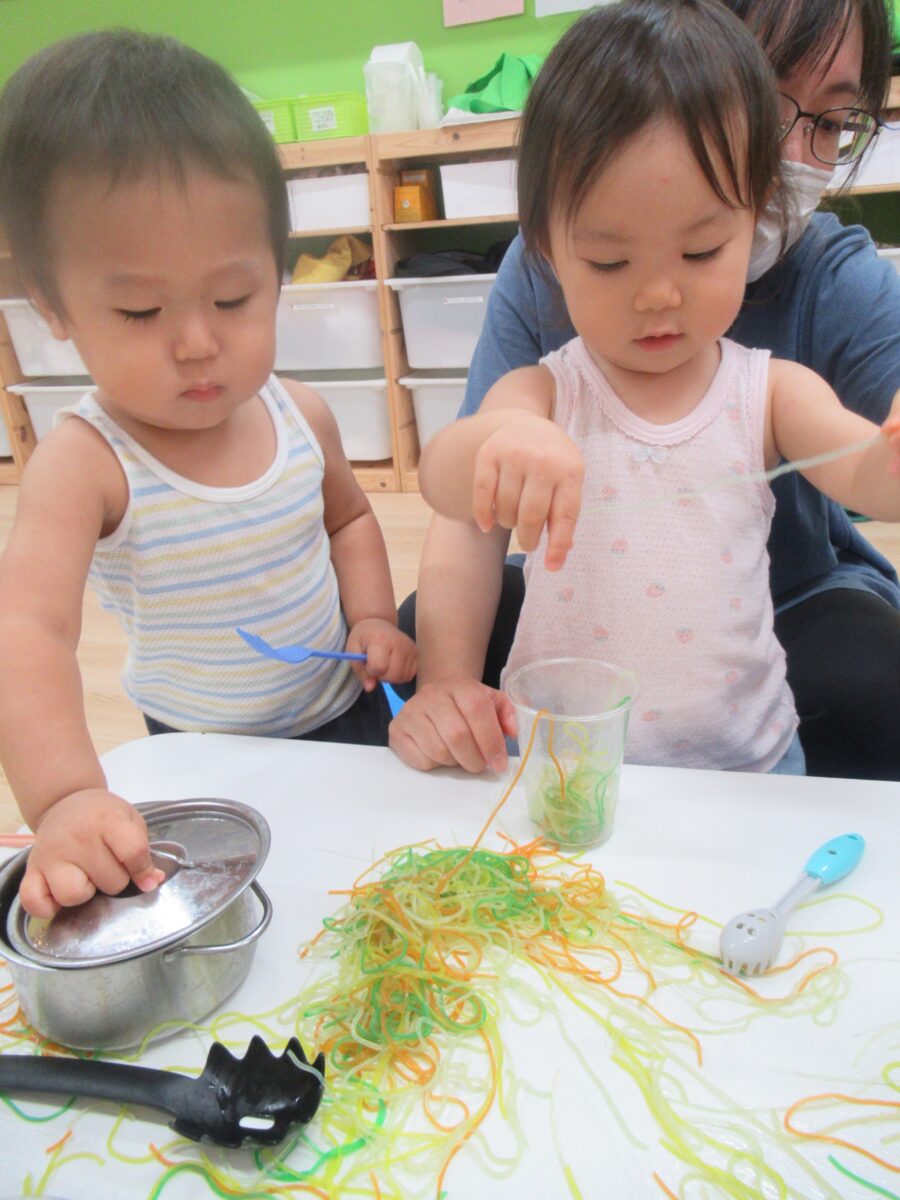 フォークやトングを使って料理ごっこを楽しみました。