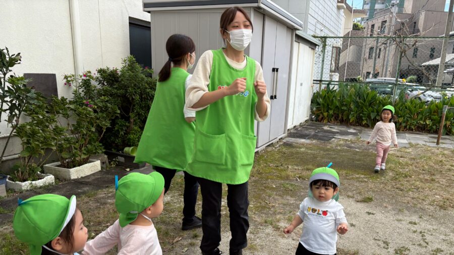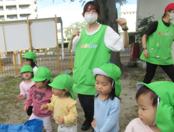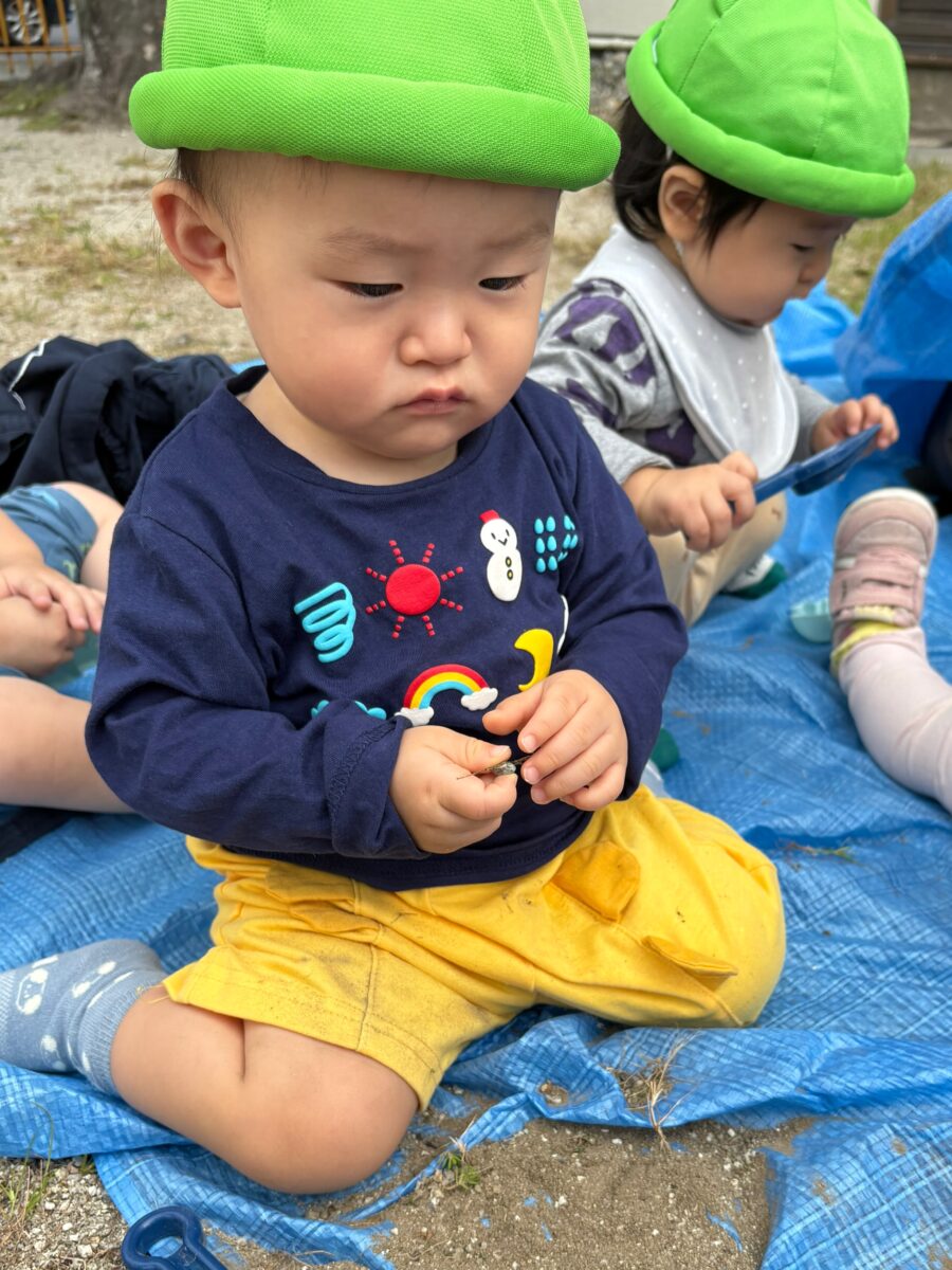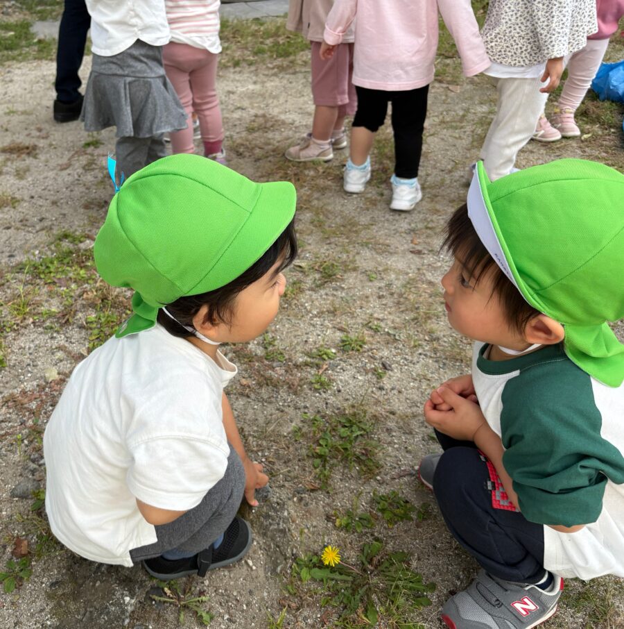 公園内の自然物を見たり、お友だちと触れ合い遊びをしました。