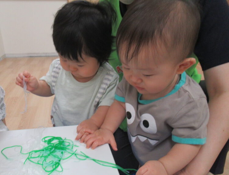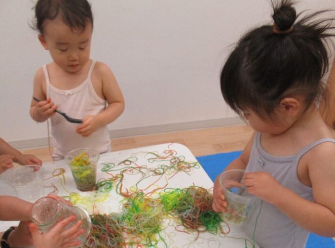 手で触って感触を楽しんだり、フォークを使っておままごとのように楽しみました。