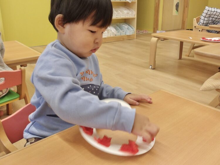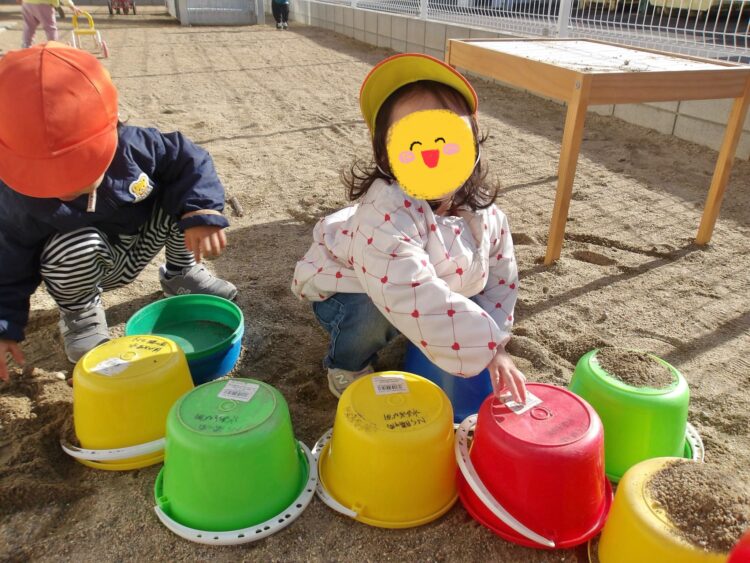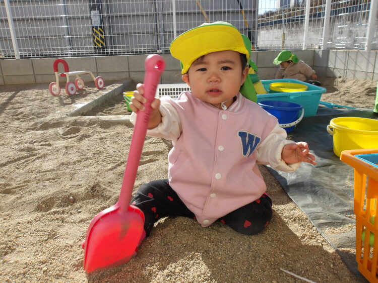 最近は保育士の真似をして、砂場で型を取る様子もみられるように![]()