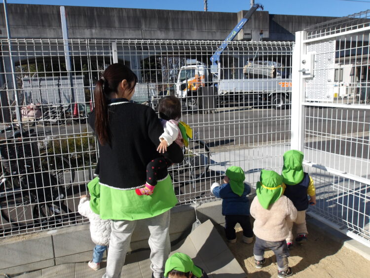園庭の向かいにクレーン車が来るとみんな集まってきて真剣に見入っていました!!荷物が吊り上げられると「おーーー!👏」と手を叩く子もいましたよ☺️