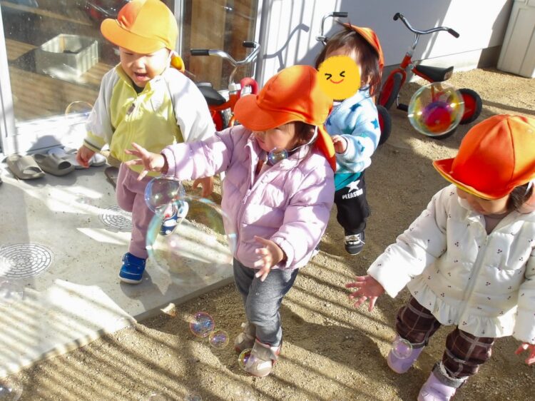 風向きが変わってあちこちに飛ぶと、一斉にシャボン玉の方へ走っていました![]()