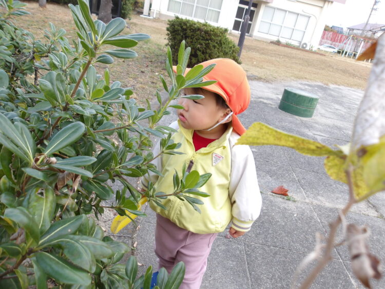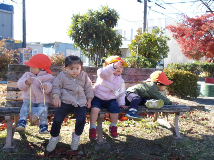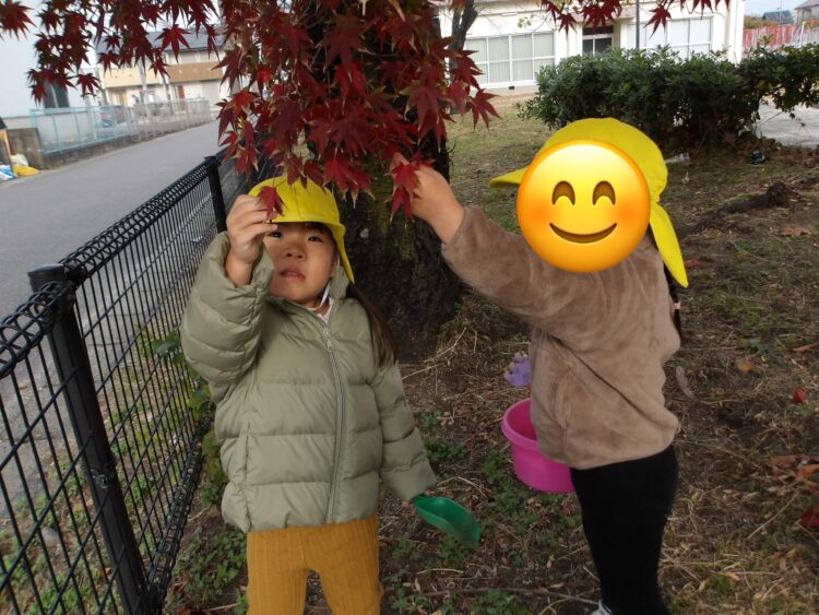 公園の木はすっかり枯葉が目立つようになりましたが、1本だけきれいに紅葉している木があり、12月に入ってからの、のんびり屋さんの紅葉狩りツアーに夢中の子どもたちでした![]()