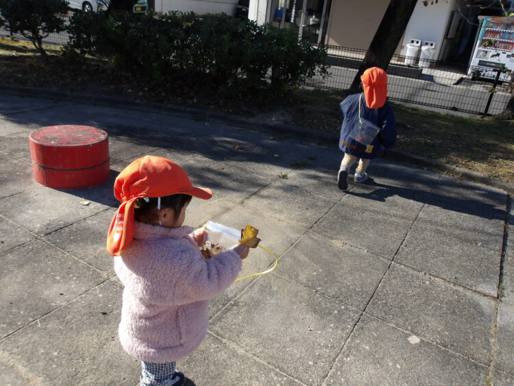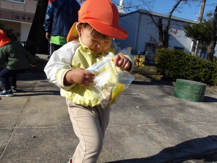 今日は、1人1つ、木の実や葉っぱを入れることができる”お散歩バッグ”を持って行きました。