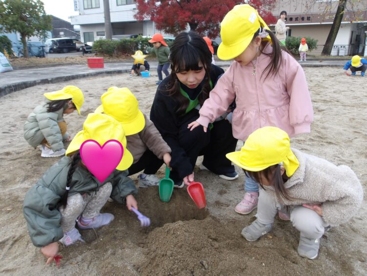 結局、虫は見つからなかったものの、お砂場遊びに変更し、お山作りや穴掘りに夢中になっていました![]()