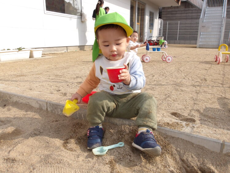 園庭に出て日向ぼっこをしたり、お砂場で砂の感触を触ったりして遊びました![]()