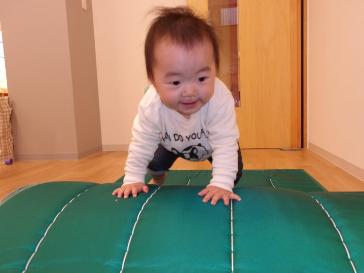 マットの上にゴロンと寝て、転がって下りてみたり、ハイハイや一人歩行で登り下りをしてみたり・・・。いろいろ試しながら楽しい遊び方を見つけていました🤭