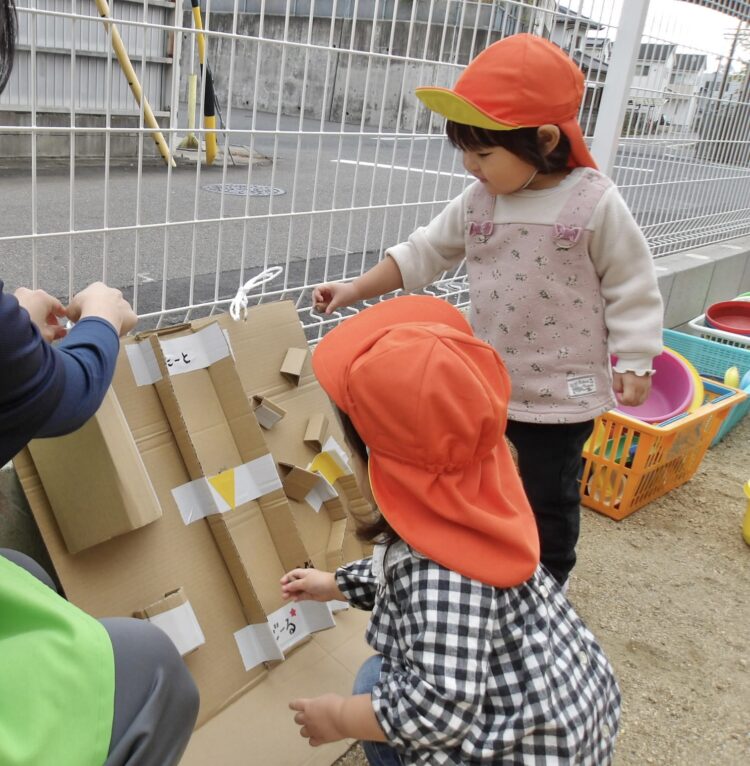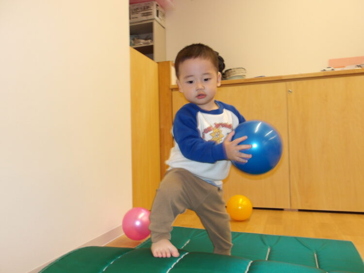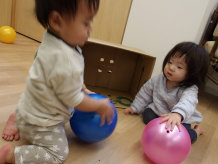 ボールあそびも転がすだけではなく、お友だちに“どうぞ”とて渡してみたりダンボールの中に入れて運んでみたりして楽しむ姿も!!