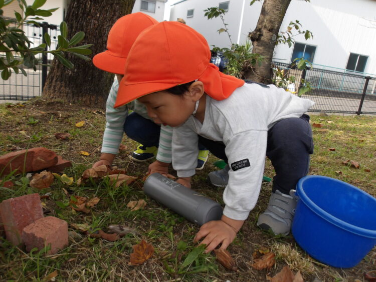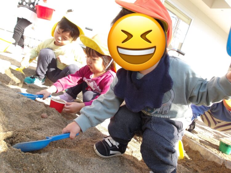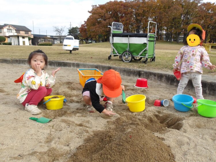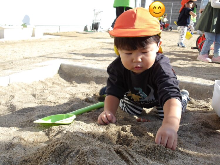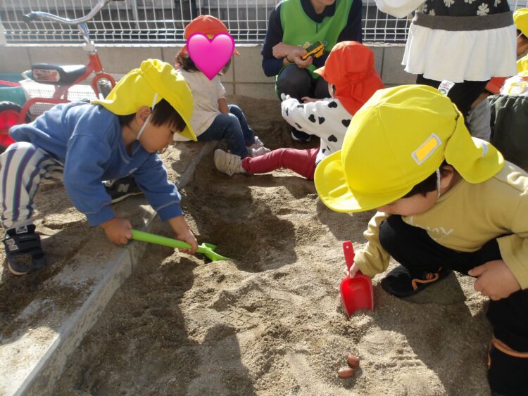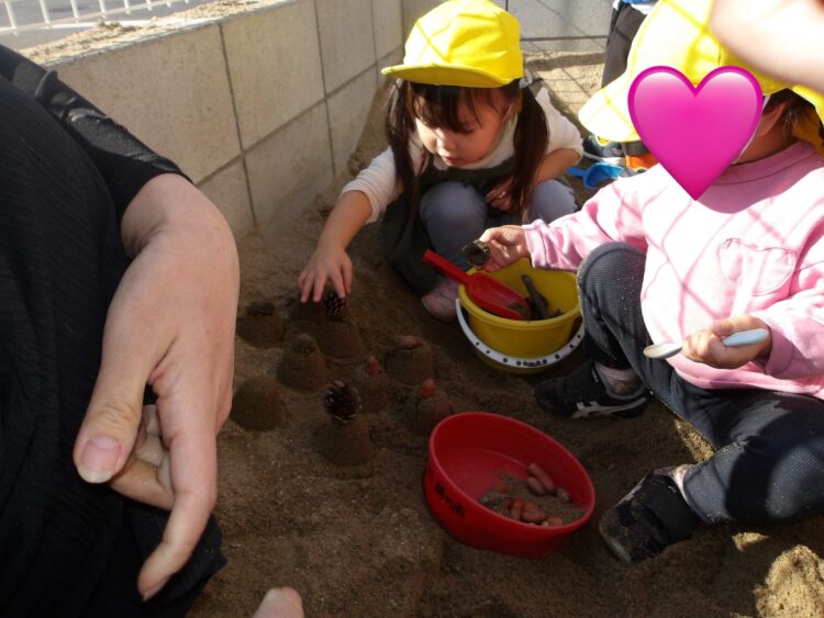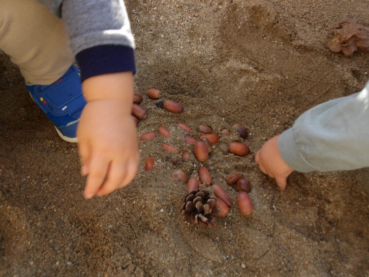 園庭に出るとすぐにどんぐりを砂場に持っていって、撒いたり集めたりして遊び始めます🍂