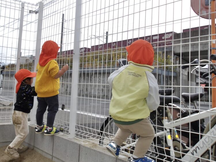 フェンス沿いでは、みんなで並んで貨物列車をお見送りしていました🚃
