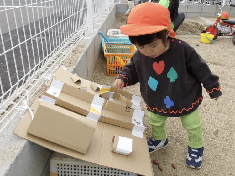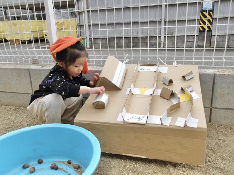 園庭では、どんぐりを転がすコースを設置して遊びましたよ![]()