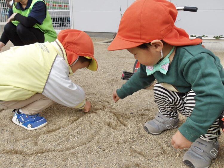 公園で拾った木の枝を使って、地面にお絵描きも🖍️