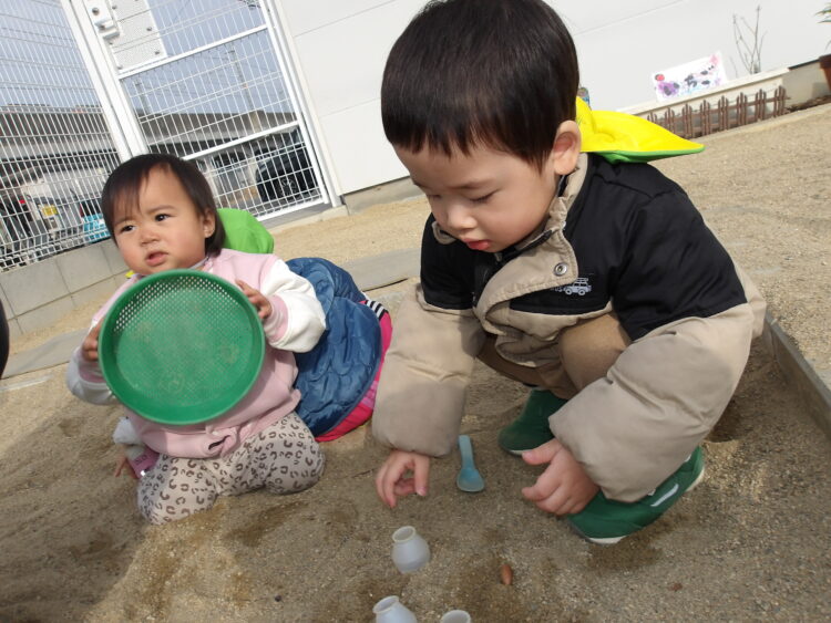 ふるいを使ってふりふりしたり、砂に隠れたどんぐり探しをし遊びました![]()