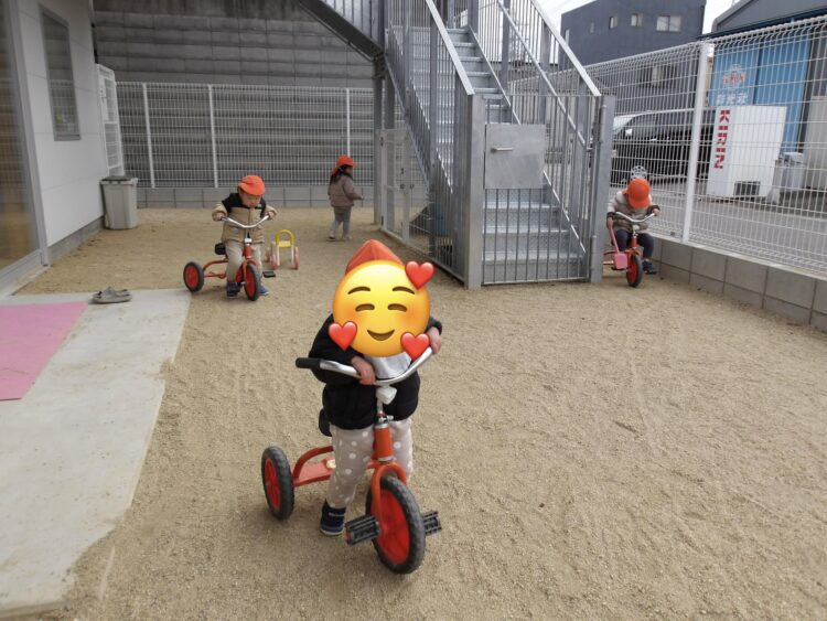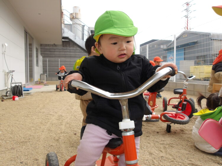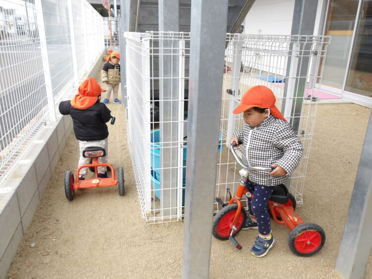 みんなで揃って乗って、真剣に三輪車を進めていました💕