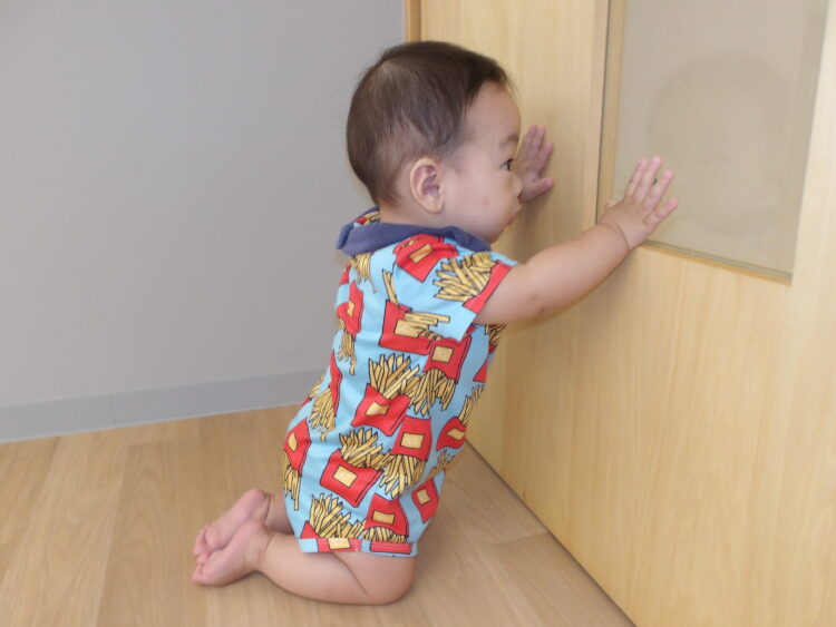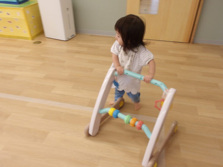 歩行器を使って保育士のいる方を目指して、よいしょ!よいしょ!![]()