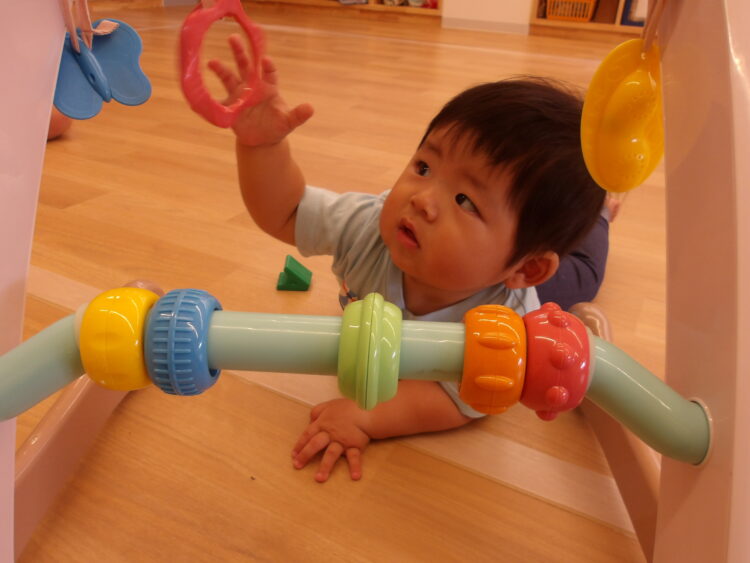 カラカラと回すと音が鳴る玩具に興味津々![]()