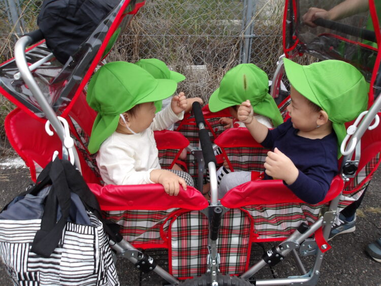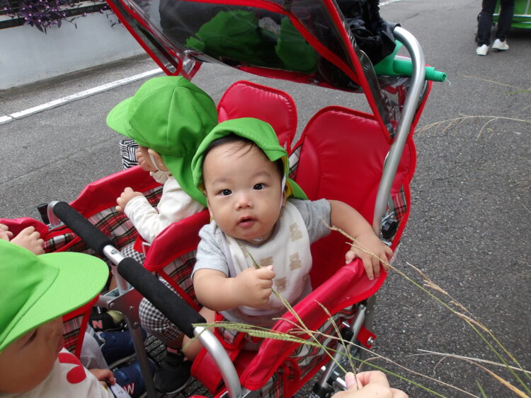 行き道に猫じゃらしを見つけて、お散歩カートに一緒に座っているお友だちに見せ合っていました![]()