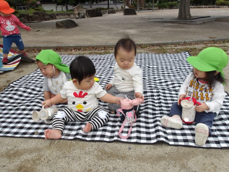 公園に着くとピクニックシートの上でお茶を飲んで休憩タイム〜![]()