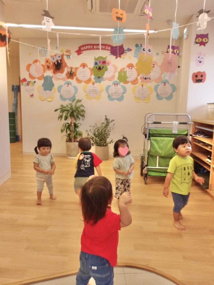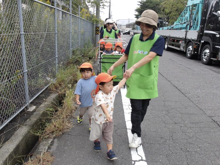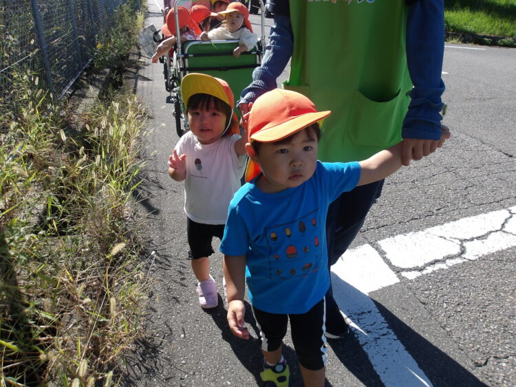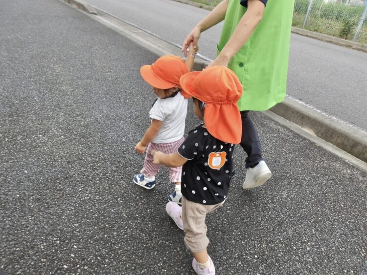 あひる組さんのお友だちは交代しながら保育士と手を繋ぎ歩いてお散歩もしましたよ😊楽しかったね!