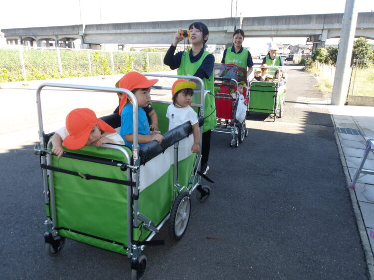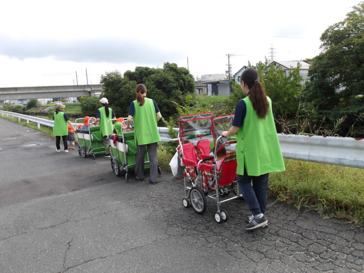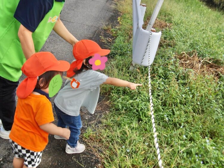 今日は雨も上がり、いいお天気になりましたね!ひよこ組とあひる組で仲良くお散歩に出かけてきました。今日は線路&川沿いコースです。