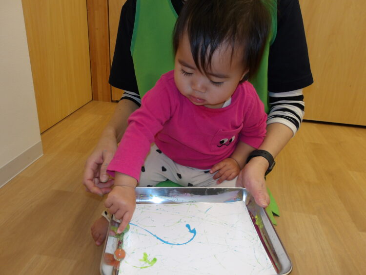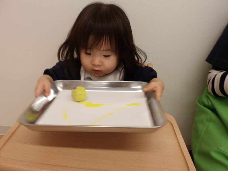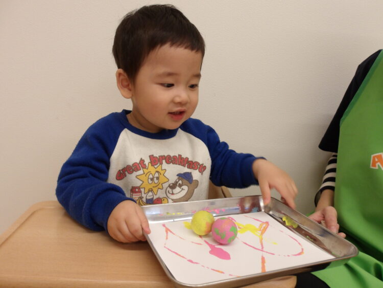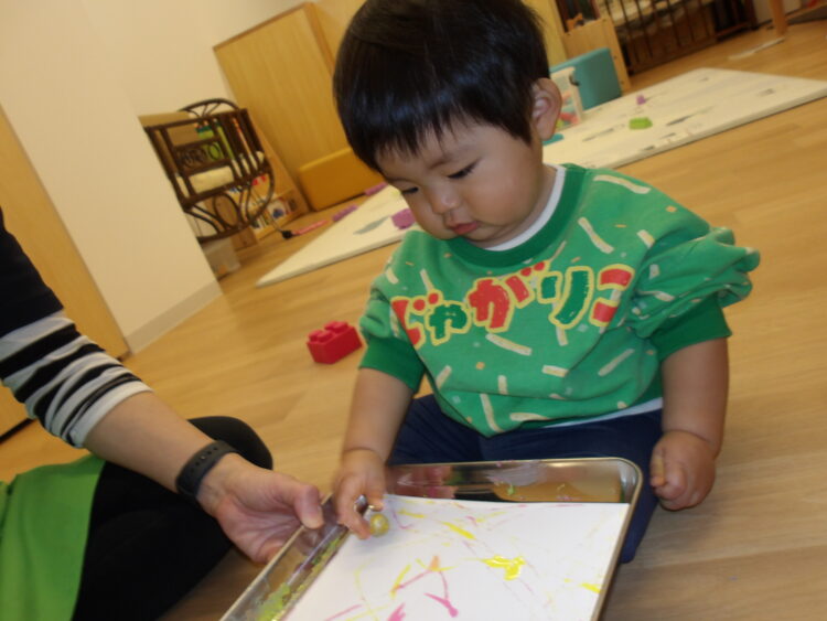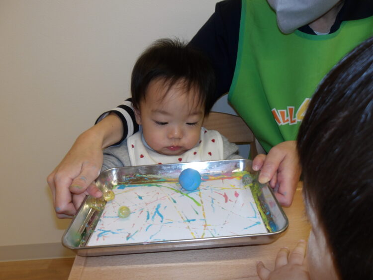 今日はビー玉や小さなボールを使った絵の具あそびをしました。