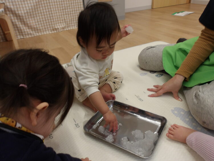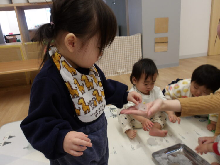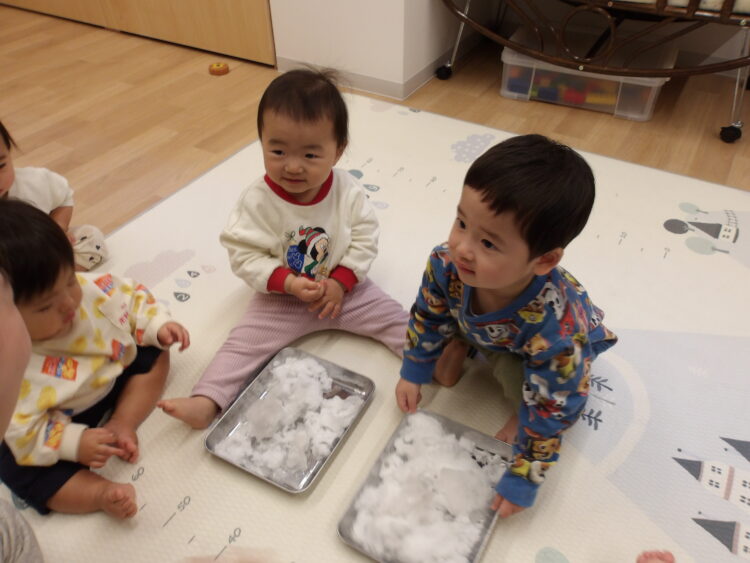 今日のひよこ組さんは昨晩に降った雪をお部屋で触って遊びました![]()
