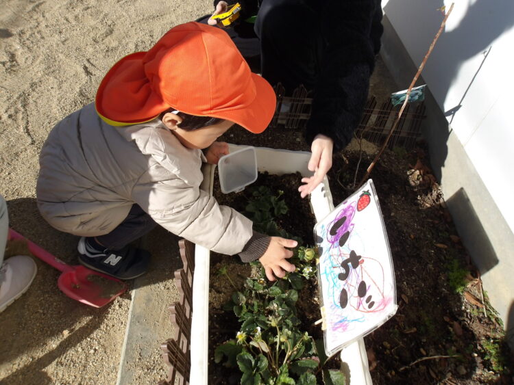 花壇のいちごの実が大きくなってきました![]()