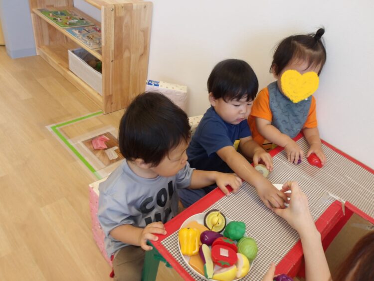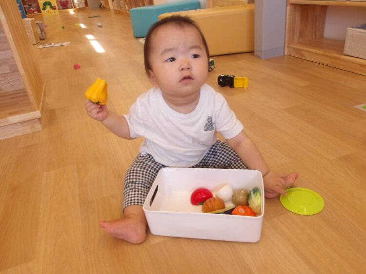 おままごとコーナーの食べ物のおもちゃを見つけるとハイハイで一目散に向かって行き、箱に入れたり出したりを楽しんでいました😃