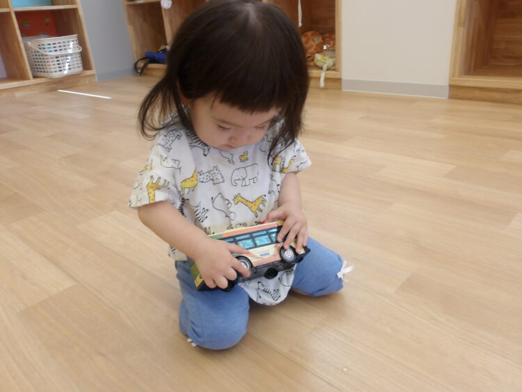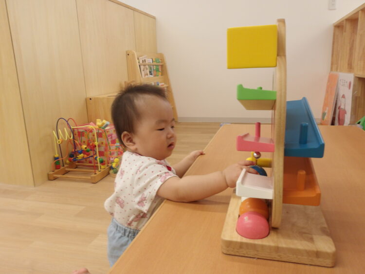 慣れたきたひよこ組の保育室でいろんなおもちゃを手にして試してみたり・・・。