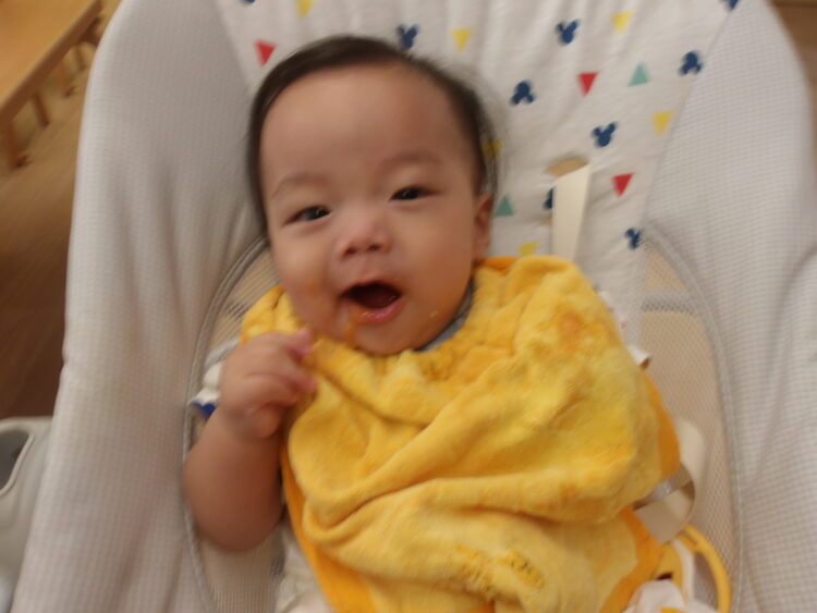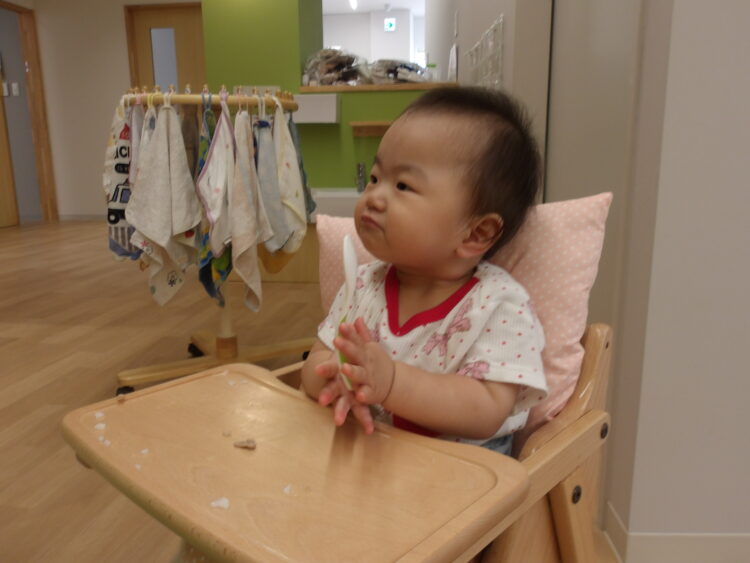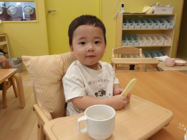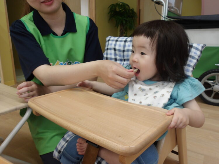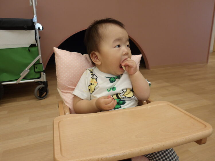 保育士に食べさせてもらったり、自分でもおやつを持ち意欲的に食べれるようになってきまさした!!
