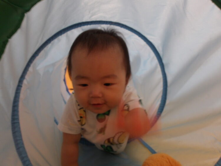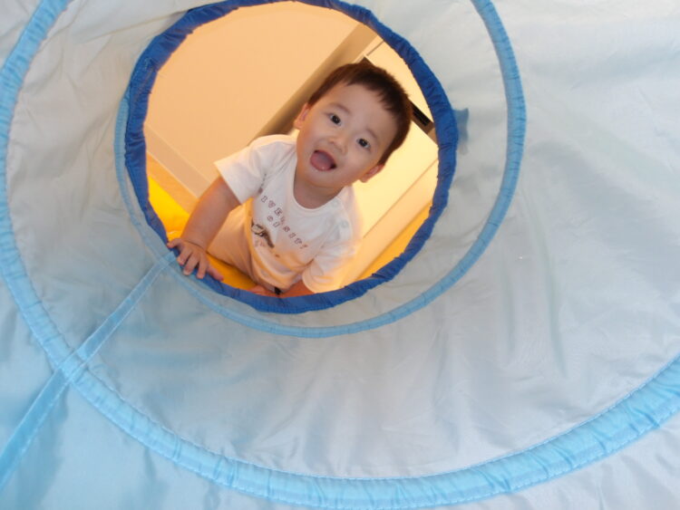 お部屋にトンネルを出してみました。最初は不思議そうに覗いたり中に入るのに躊躇している子もいましたが、しばらくするとくぐることにもチャレンジ!!