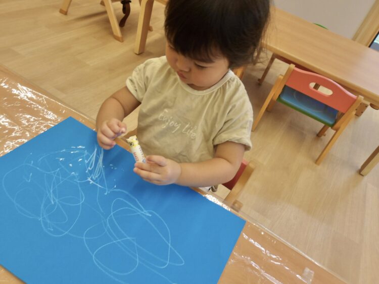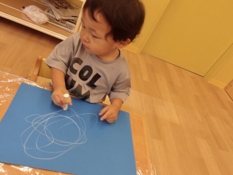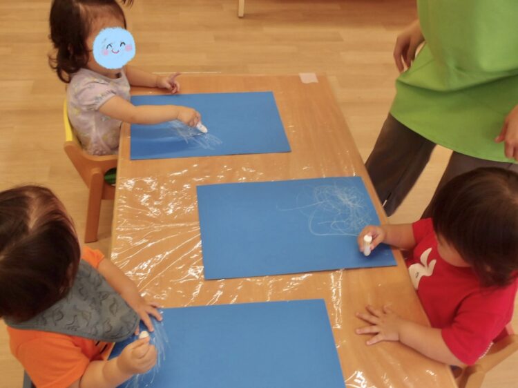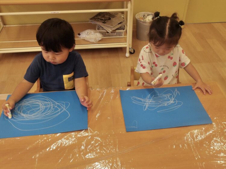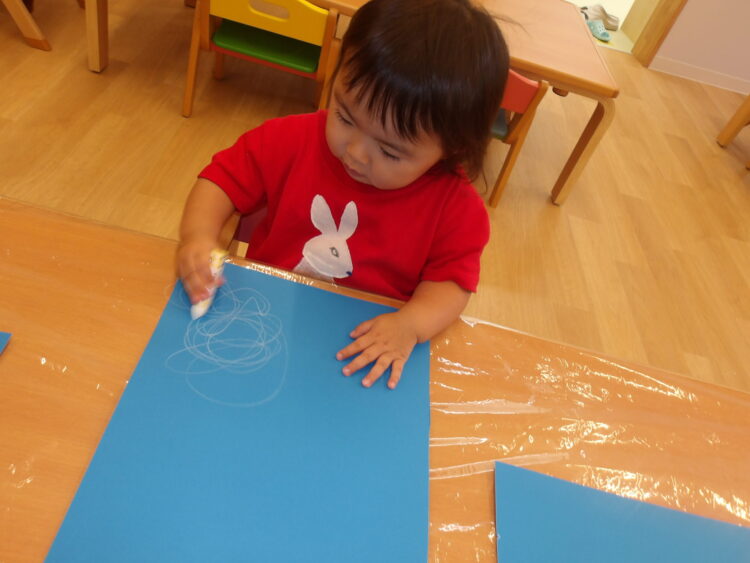 今回はみんな同じ、青い画用紙に白いクレヨンです。