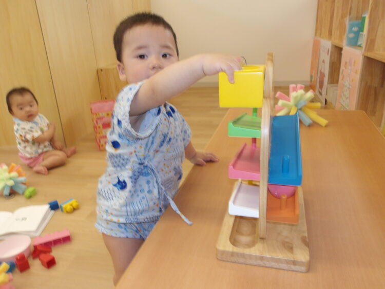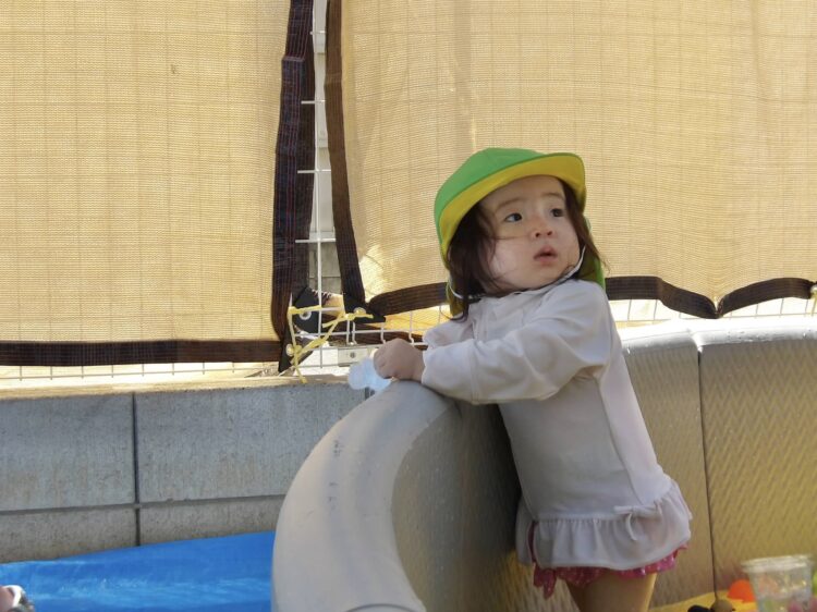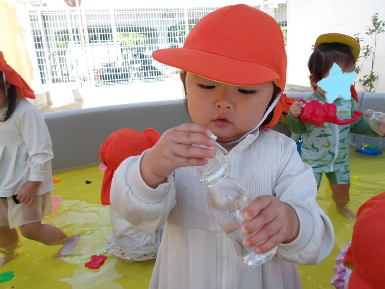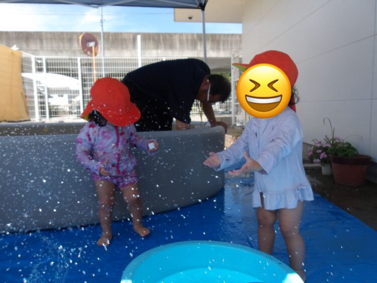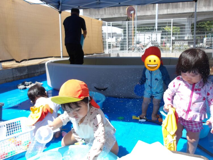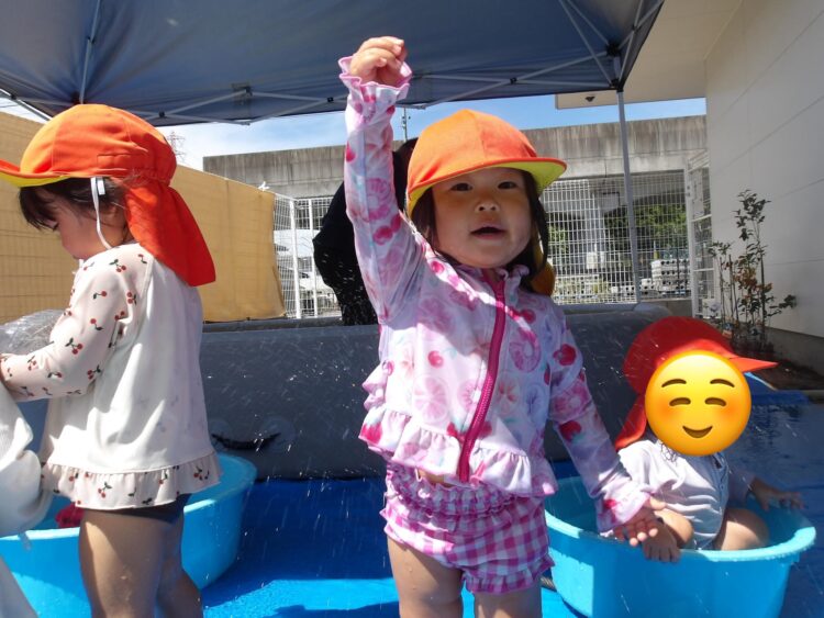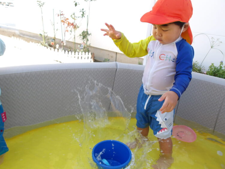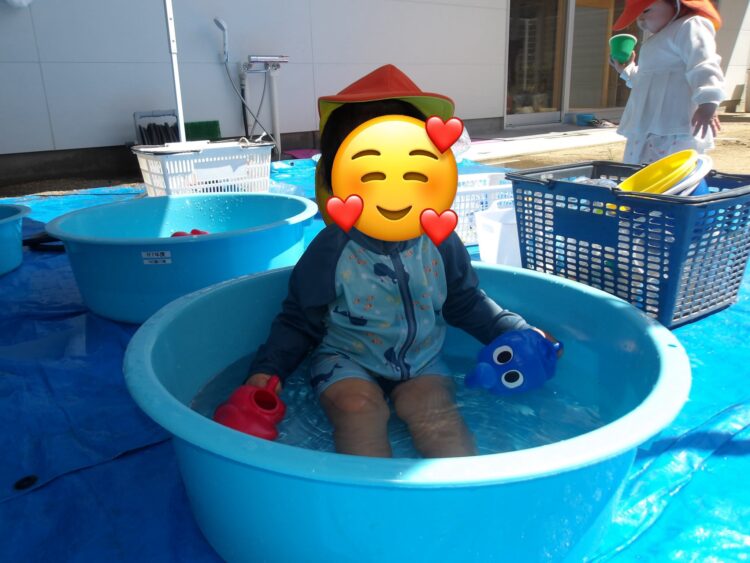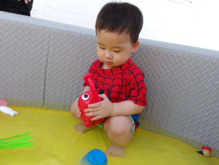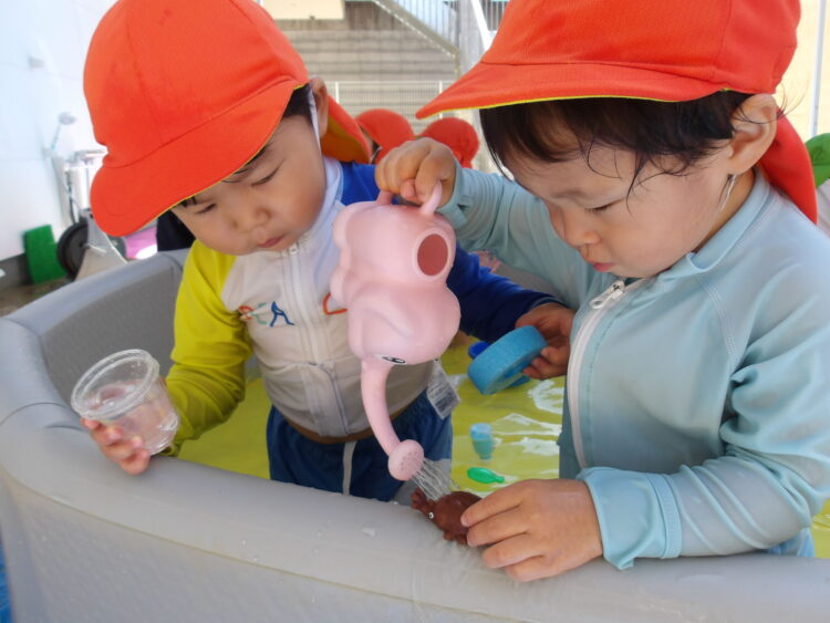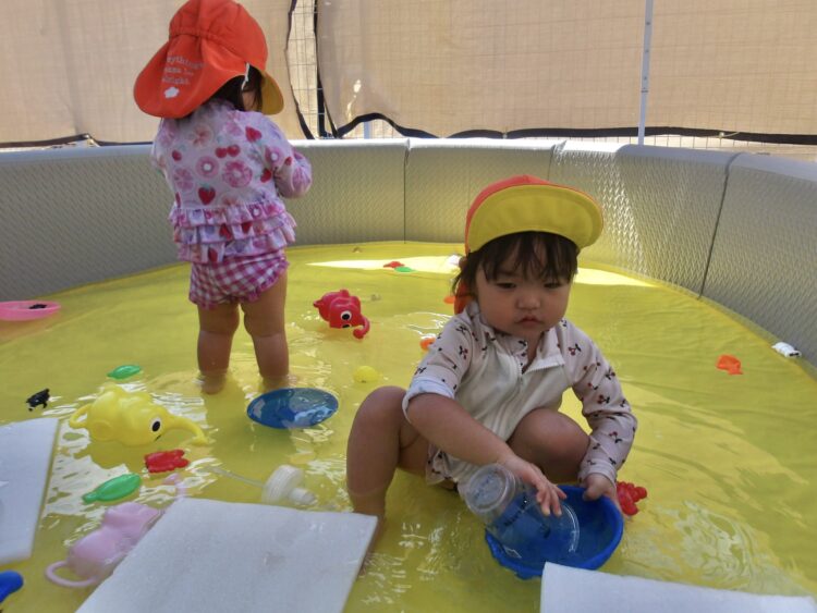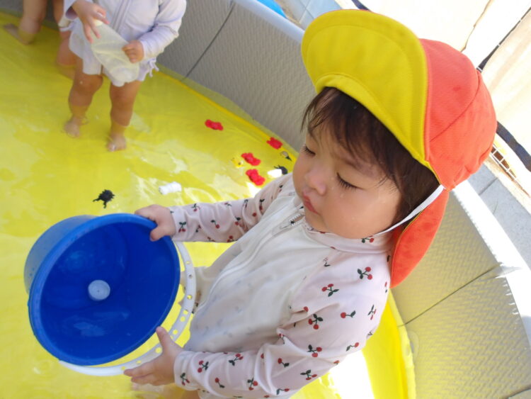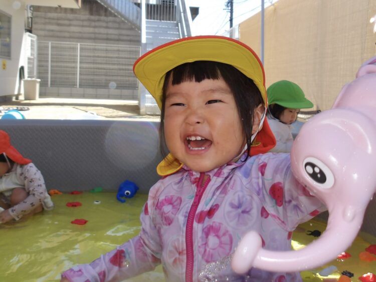 新しく入園したひよこ組さんも、初めてのお水遊び!