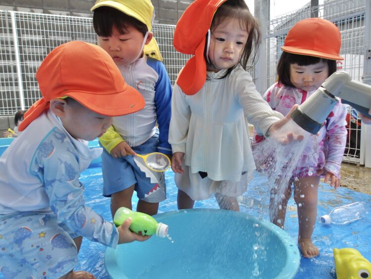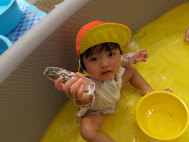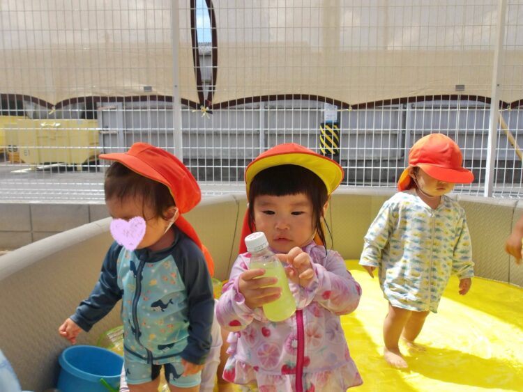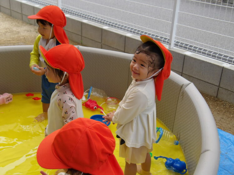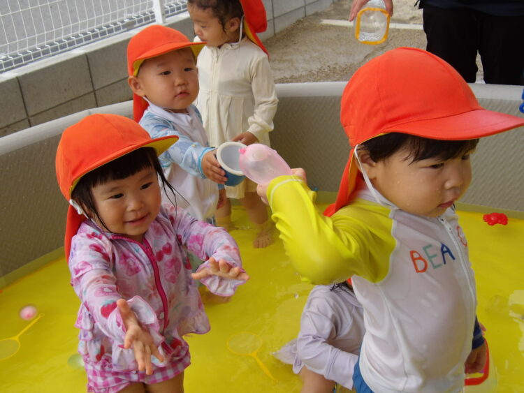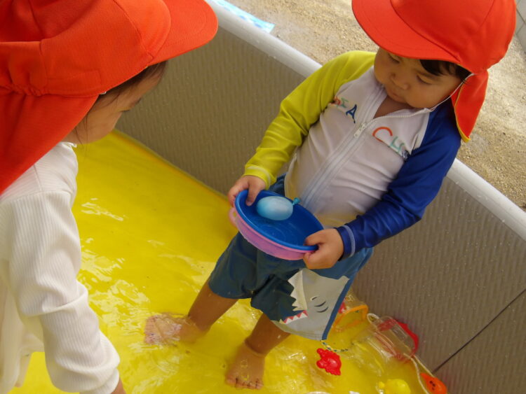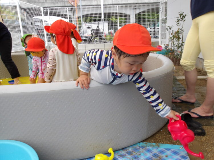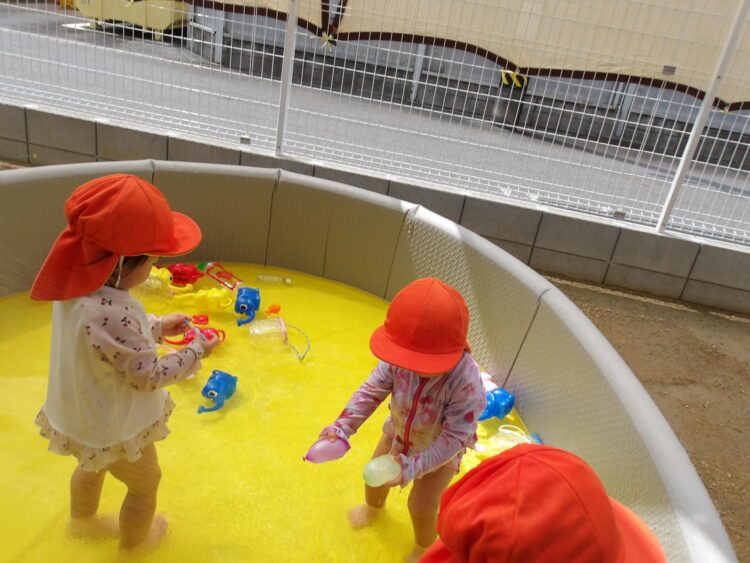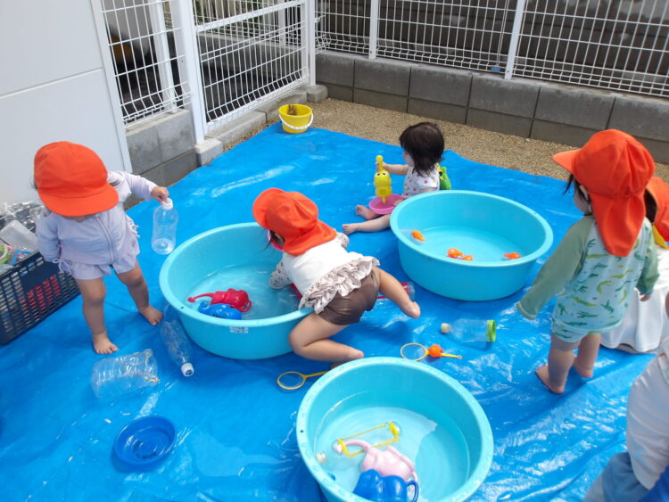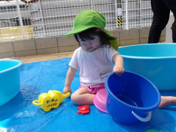 今日はいつものプールではなく、水を入れたタライをたくさん用意しました![]()