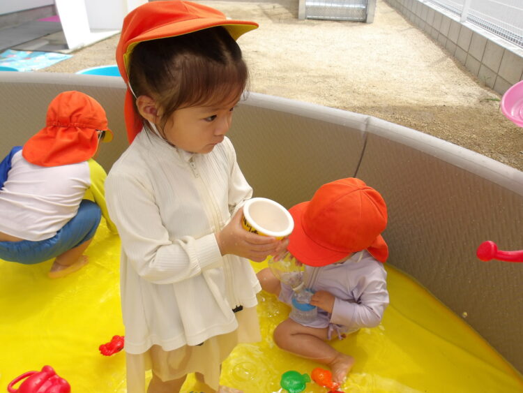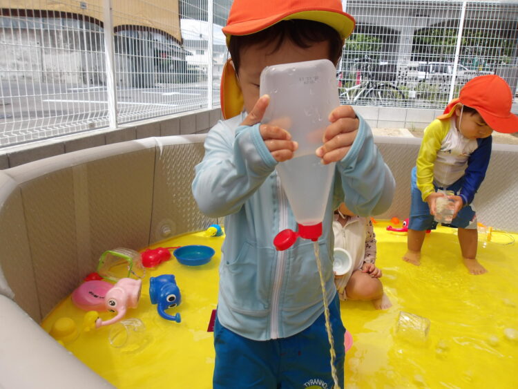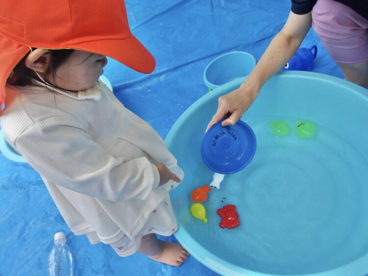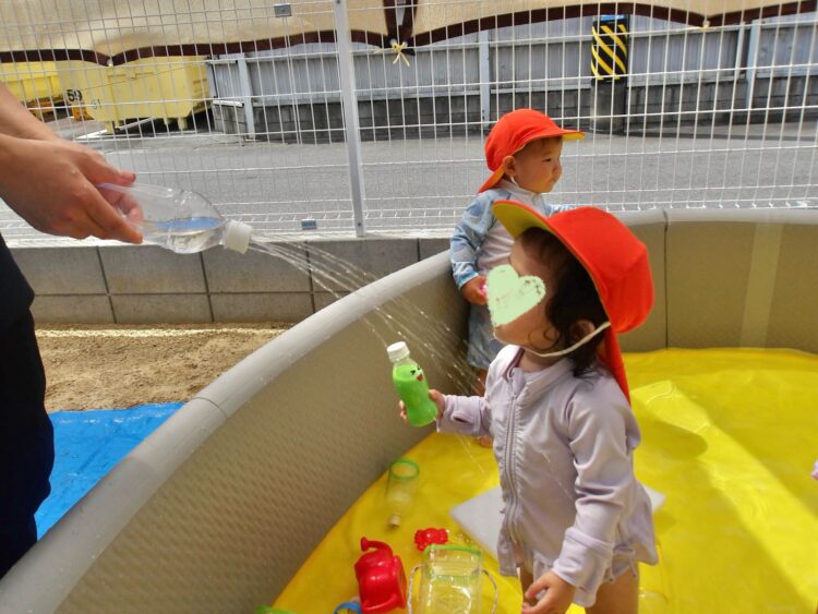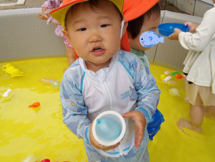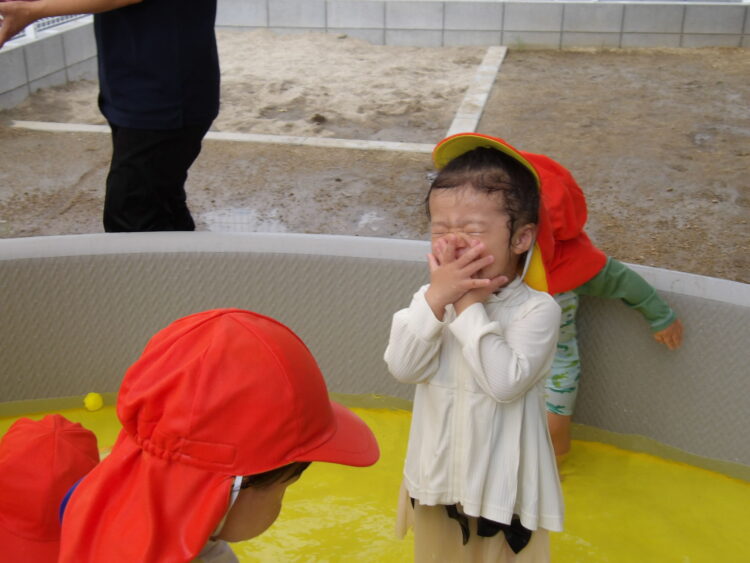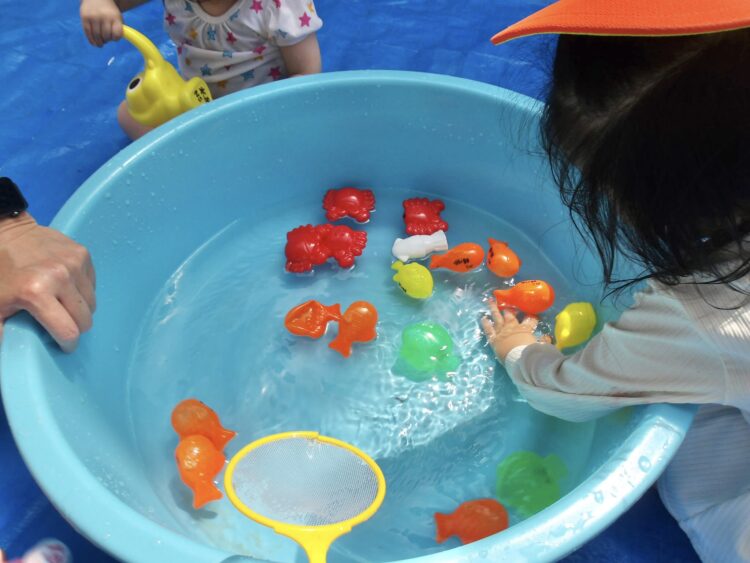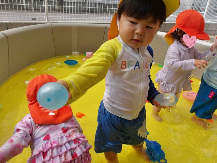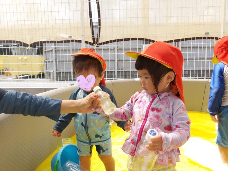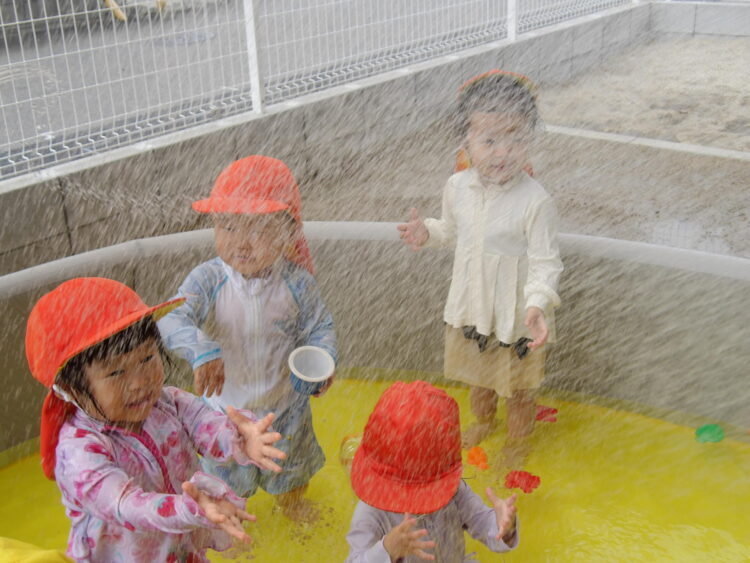 今日はいつものプールではなく、水を入れたタライをたくさん用意しました![]()
