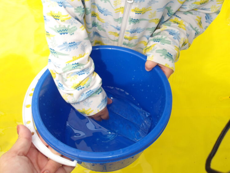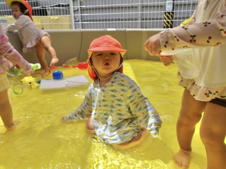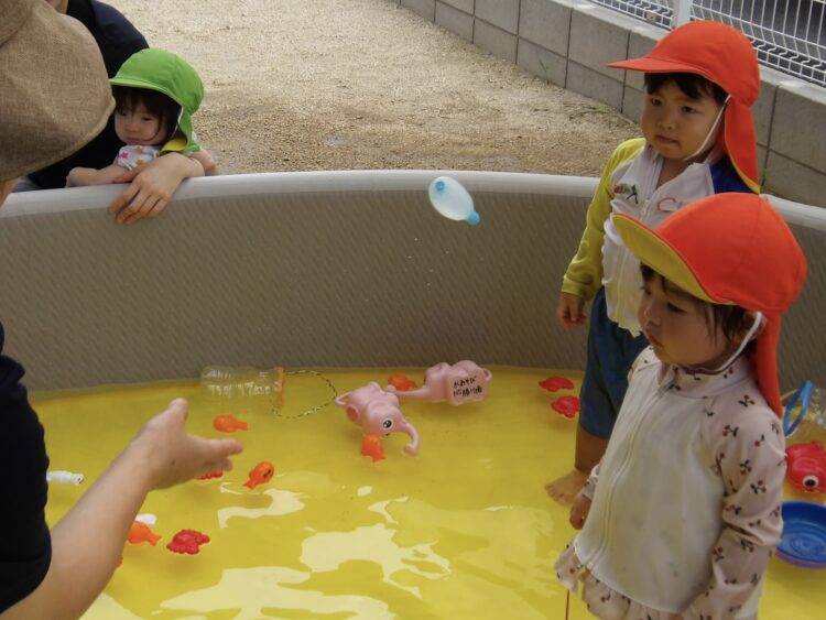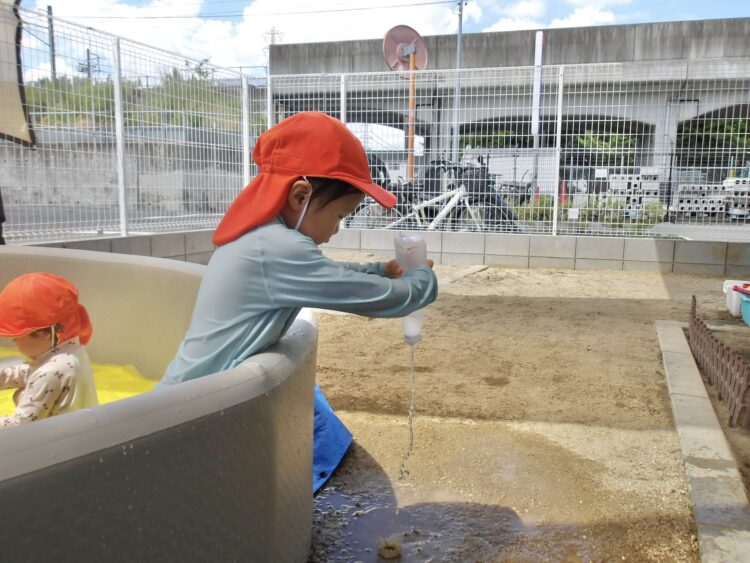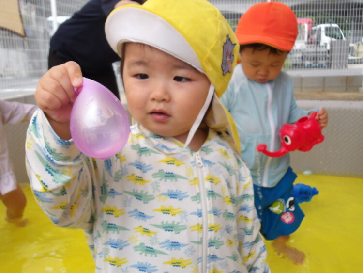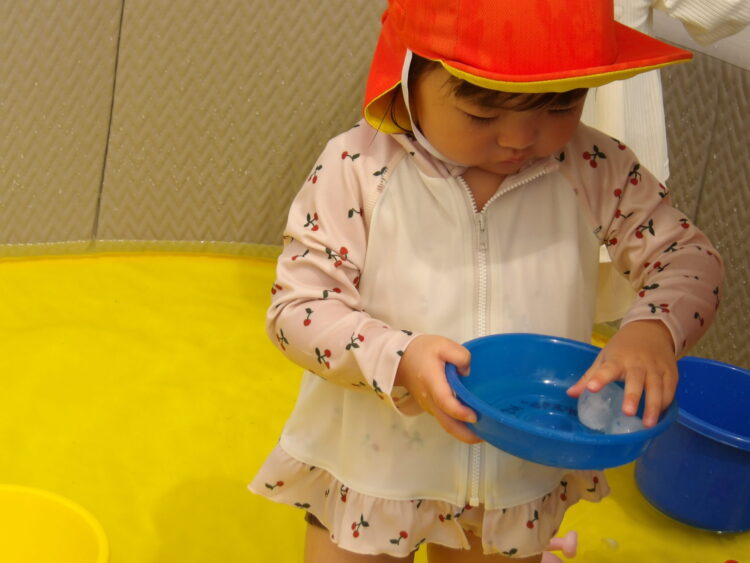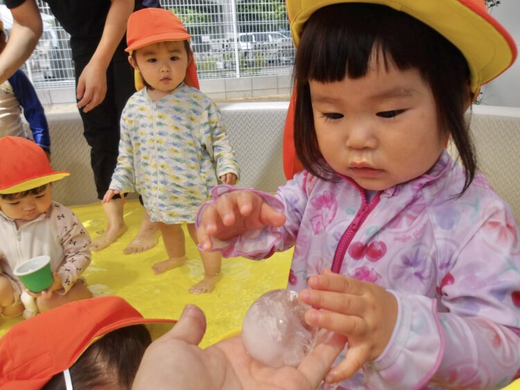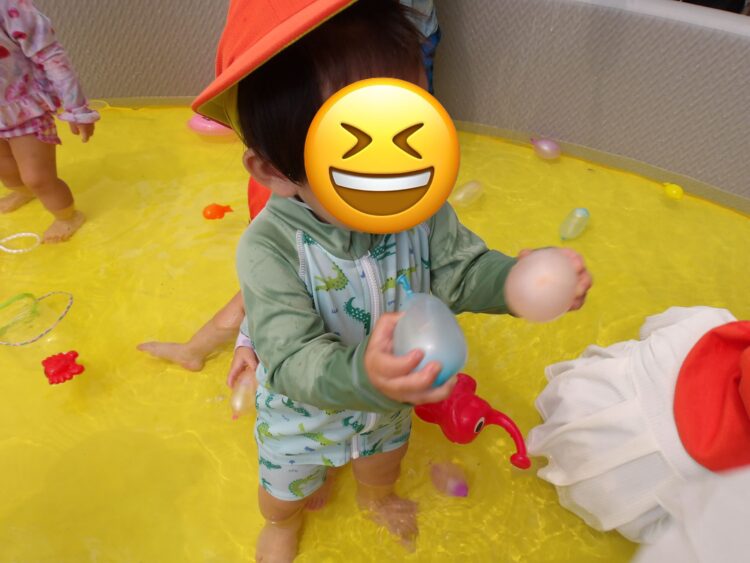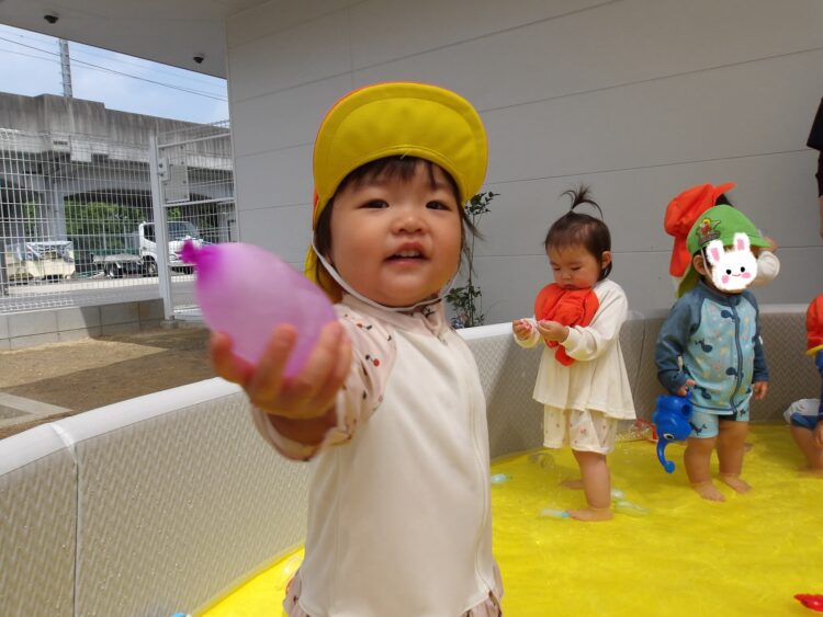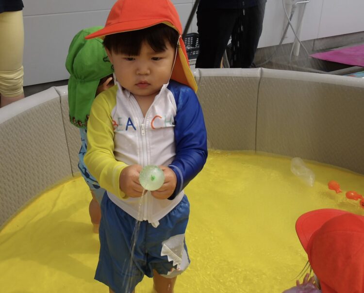 今日はいつものプールではなく、水を入れたタライをたくさん用意しました![]()
