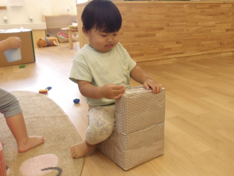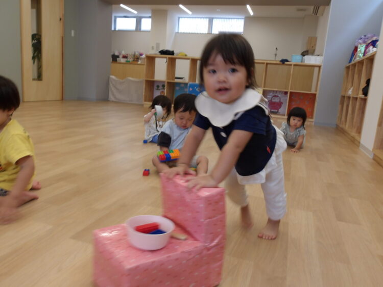 「どんな色が好き〜?」と先生が歌うと、「あか!」と言ってくれた子が![]()