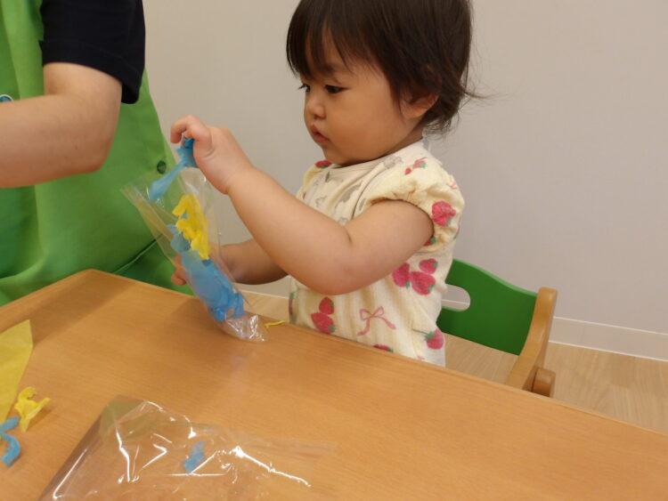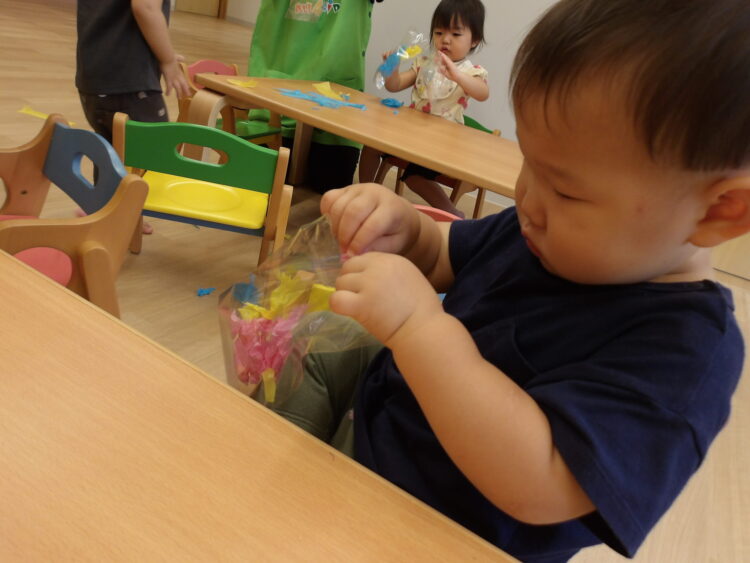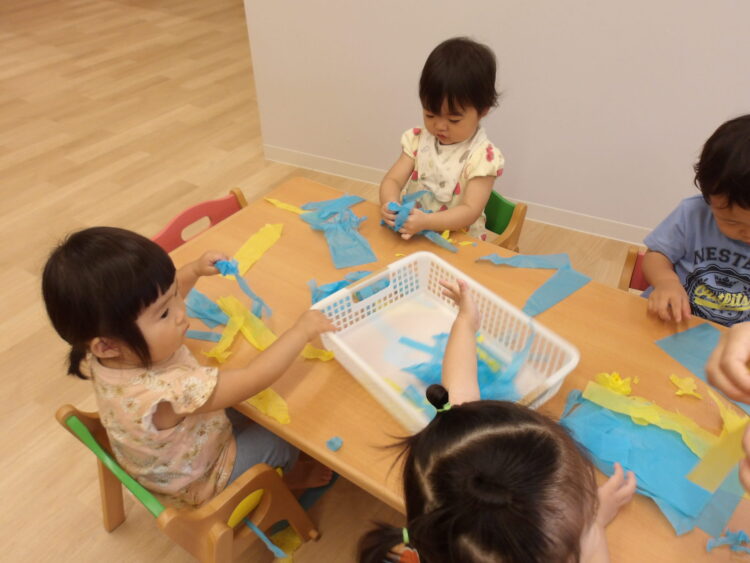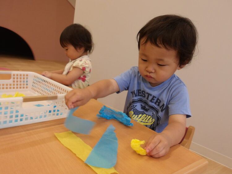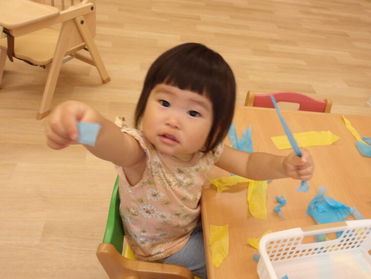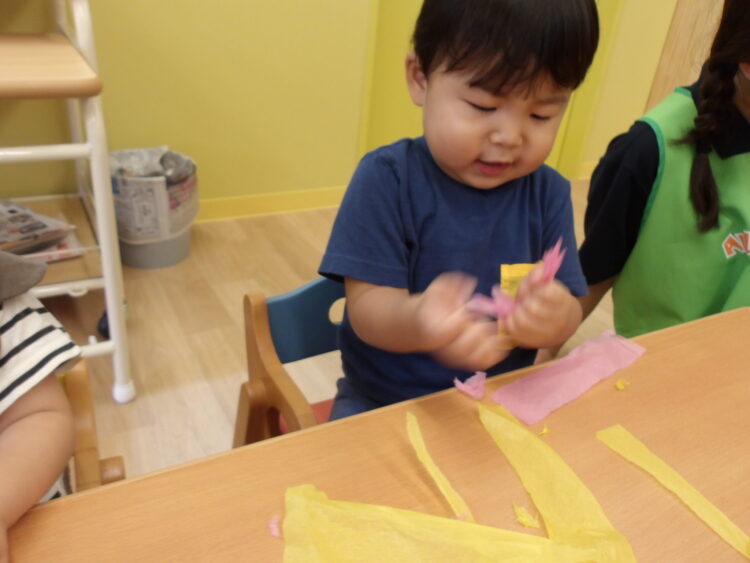 最近指先を使うのが好きなあひる組さんは、花紙を使ってちぎり遊びをしました!