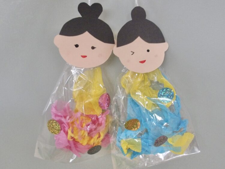 みんなでちぎって袋に入れた花紙は、織姫と彦星のすてきな着物に変身しました🩵
