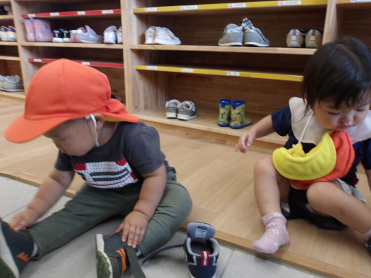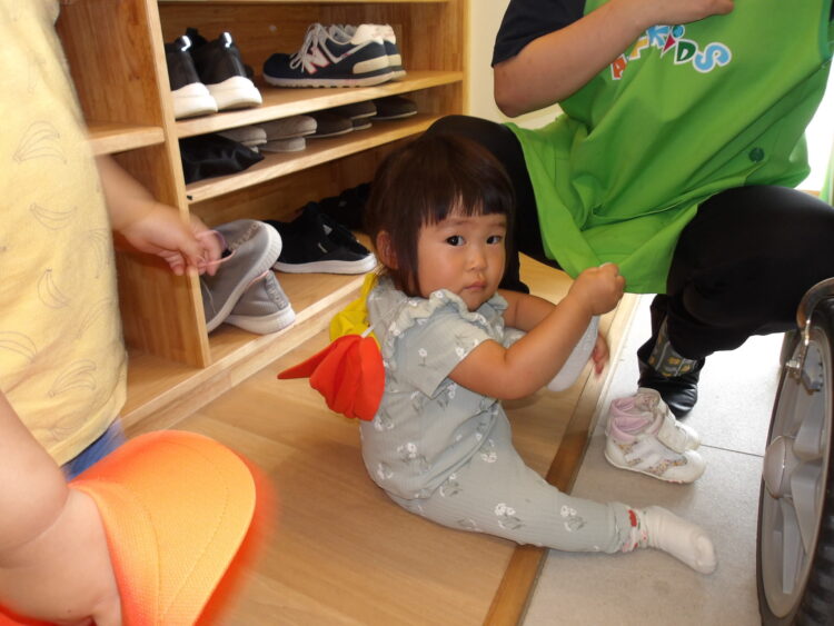 帰ってきたら靴を脱ごうね!靴のマジックテープ、上手にはがせるかな!?