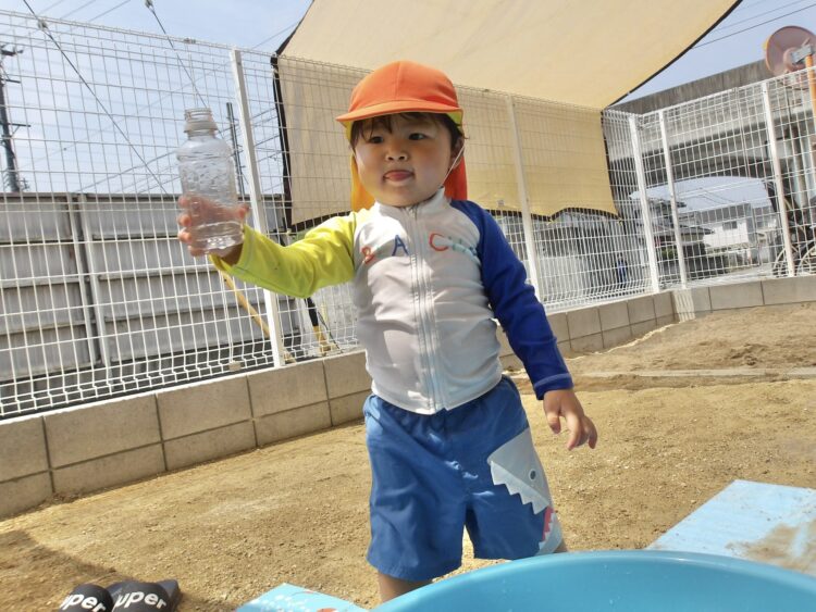 マヨネーズの空き容器にお水を入れて遊んでいますよ![]()