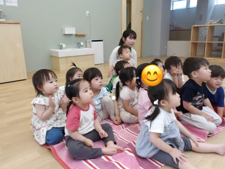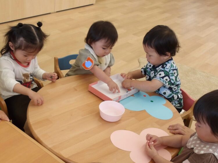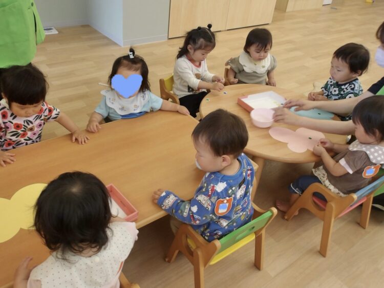 お部屋に机と椅子を用意して、座って活動するのは初めてだったので「お給食かな?」と、座っていただきますのポーズをしている子もいましたよ![]()